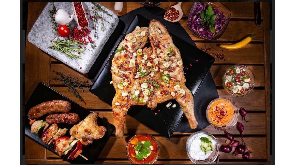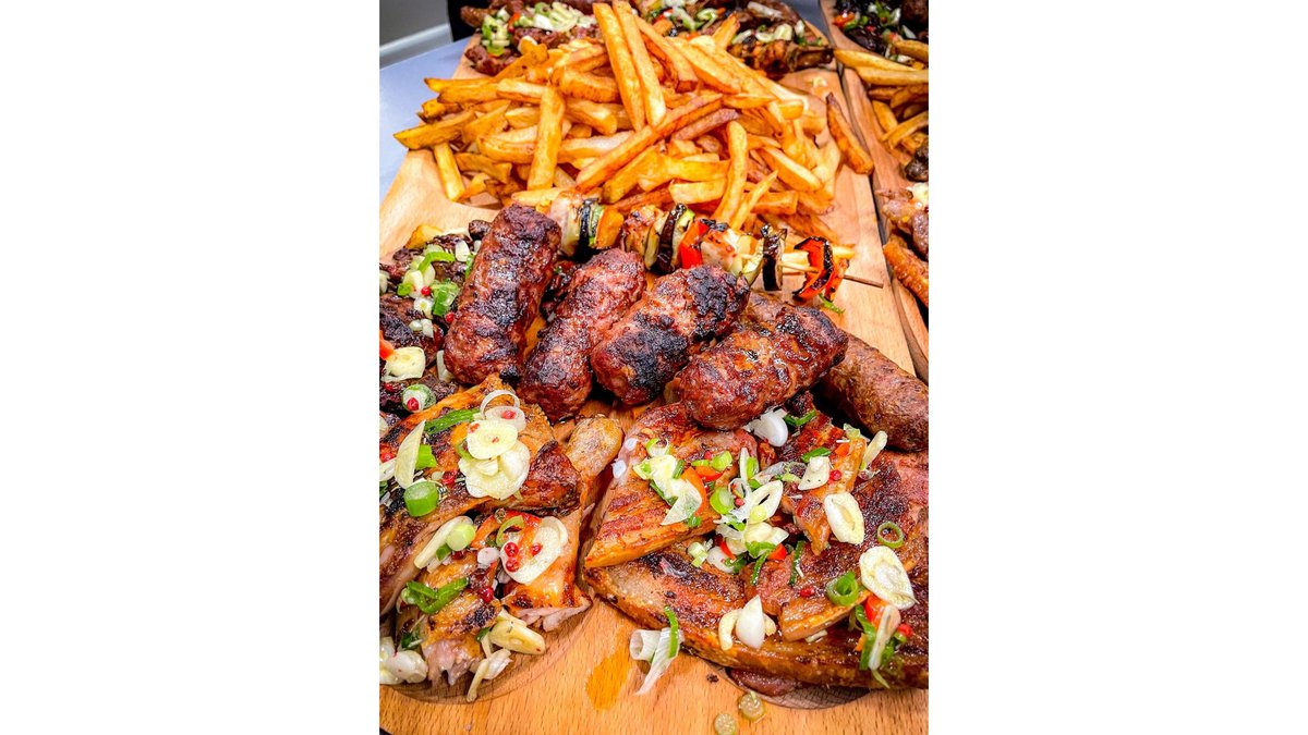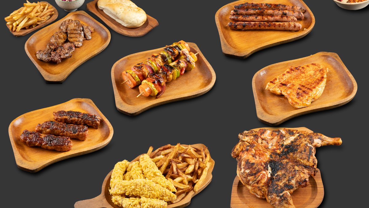 Mici (4 buc), aripioare de pui (4 buc), cârnați groși de porc (2 buc), cârnăciori subțiri de porc (4 buc), ceafă de porc (2 buc), fleică de porc (2 buc), pulpe de pui (2 buc), ficăței de pui (4 buc), frigărui de pui (2 buc), cartofi pai naturali (4 porții) sau cartofi la jar (4 buc), muștar (2 x 50 g), sos la alegere (4 x 50 g). 3500 g