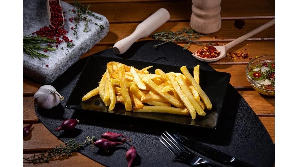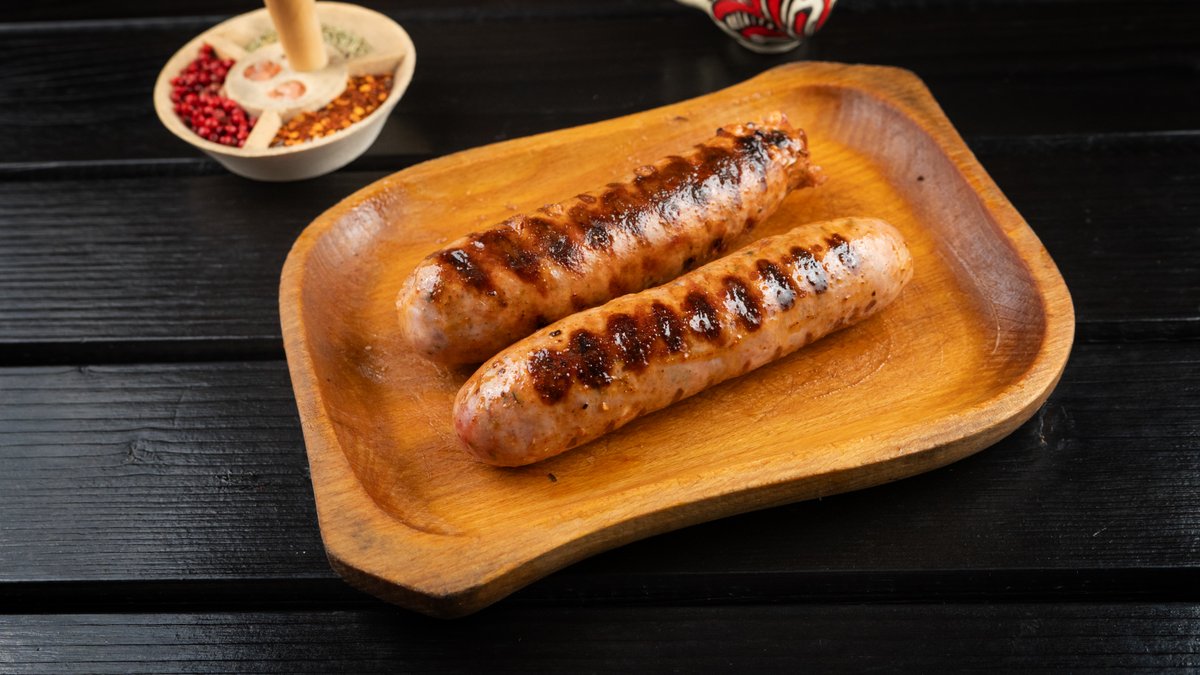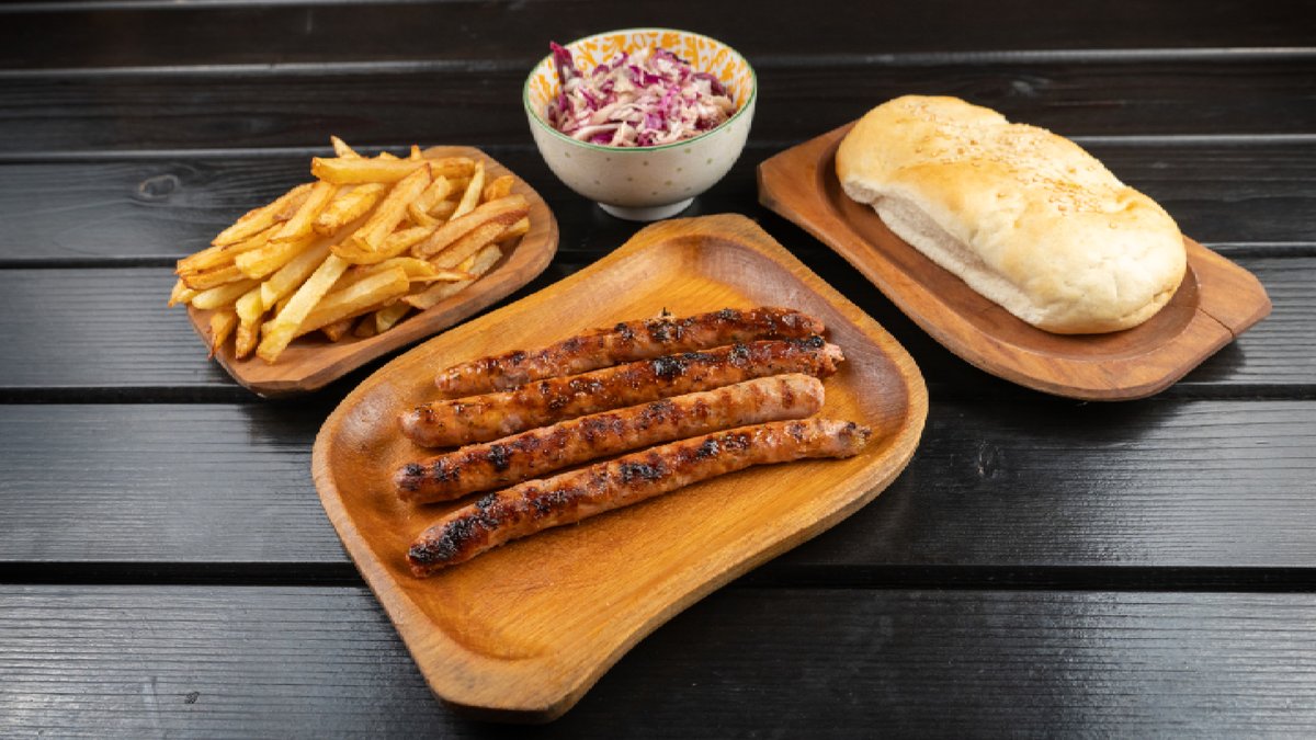Cârnăciori subțiri de porc (4 buc), cartofi pai naturali (150 g), chiflă (80 g), salată (130 g) sau sos la alegere (50 g).