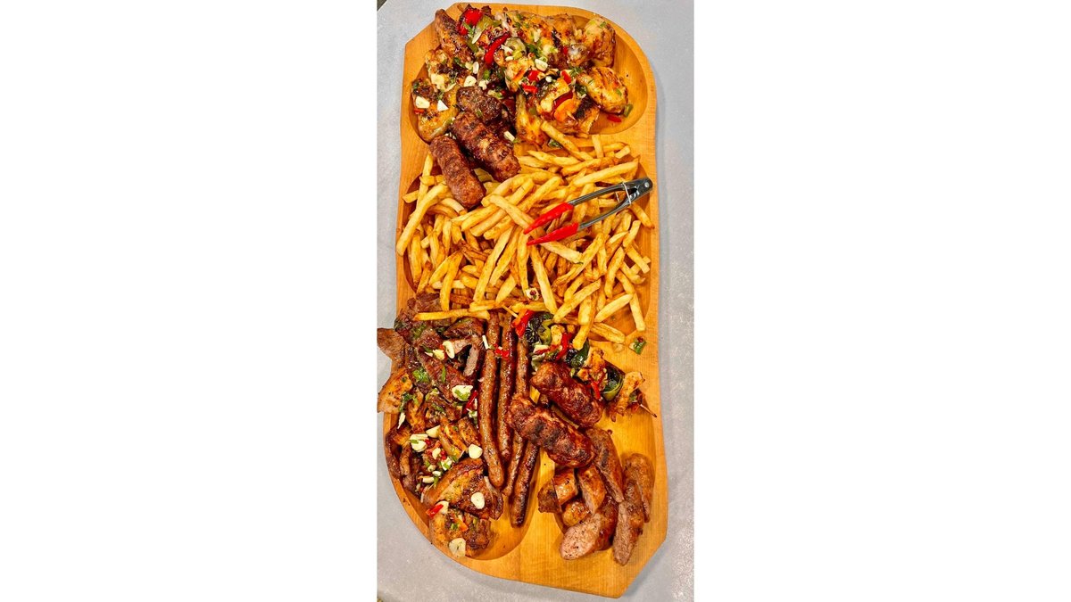 Mici (2 buc), aripioare de pui (2 buc), cârnați groși de porc (1 buc), cârnăciori subțiri de porc (2 buc), ceafă de porc (1 buc), fleică de porc (1 buc), pulpe de pui (1 buc), ficăței de pui (2 buc), frigărui de pui (1 buc), cartofi pai naturali (2 porții), muștar (50 g), sos la alegere (2 x 50 g). 1750 g