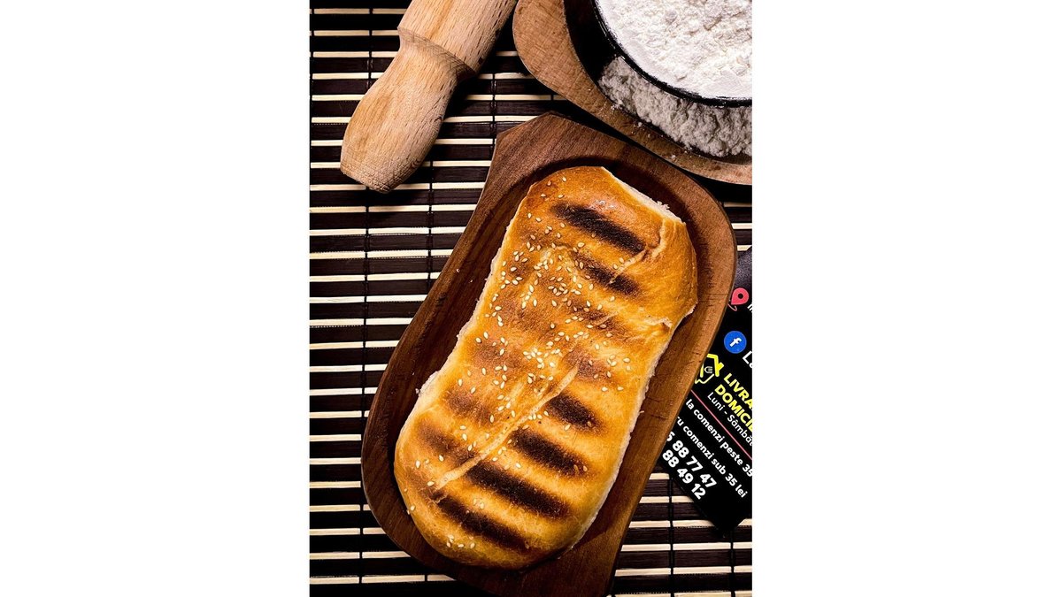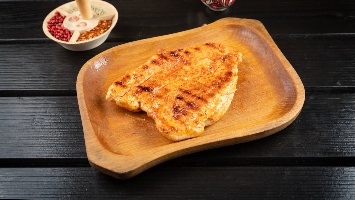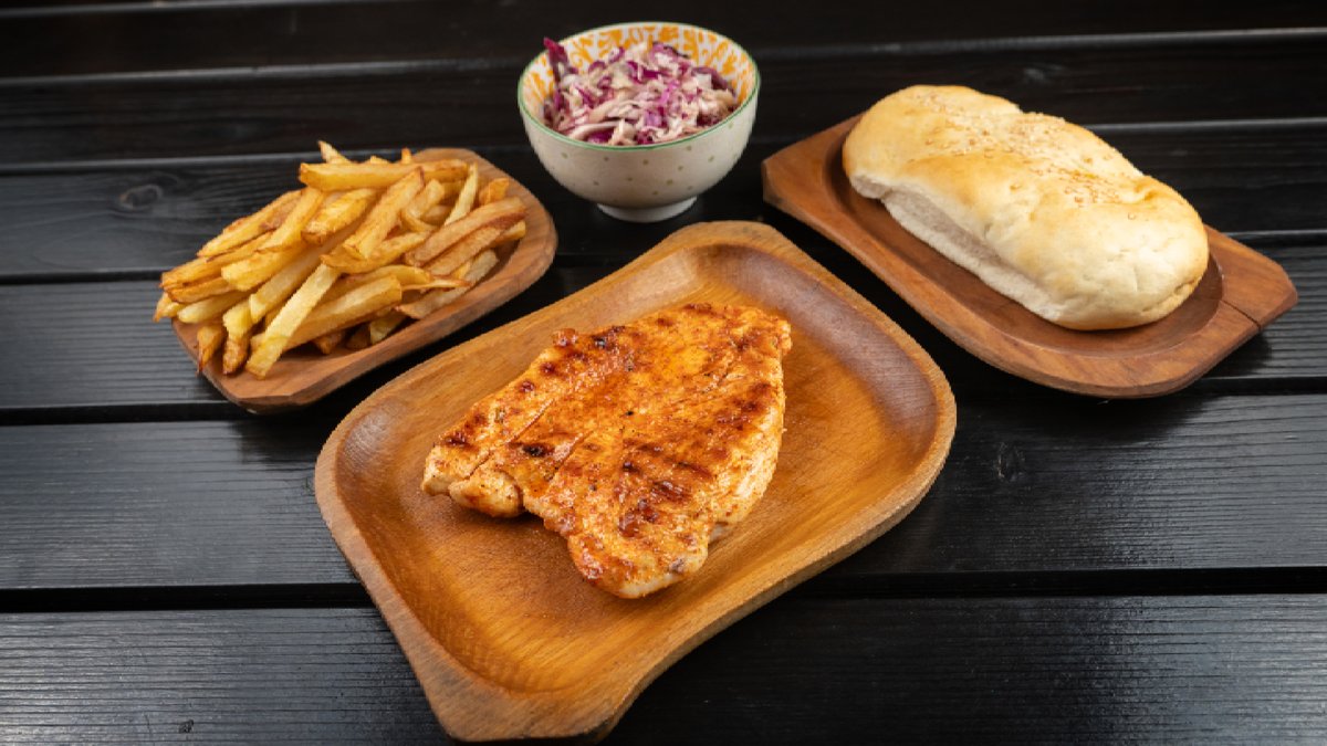 Piept de pui (150 g), cartofi pai naturali (150 g), chiflă (80 g), salată (130 g) sau sos la alegere (50 g).