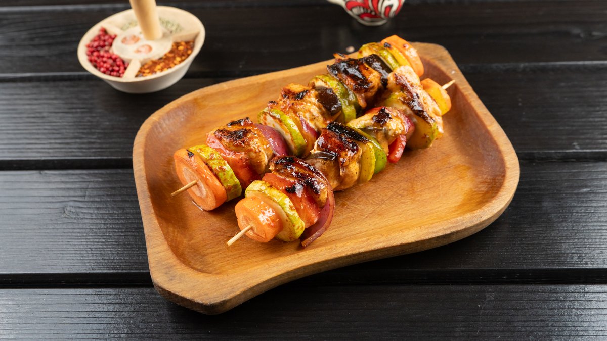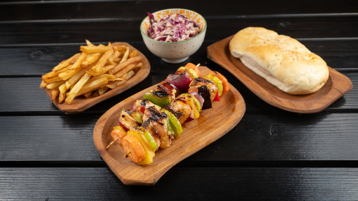 Frigărui de pui (2 buc), cartofi pai naturali (150 g), chiflă (80 g), salată (130 g) sau sos la alegere (50 g).