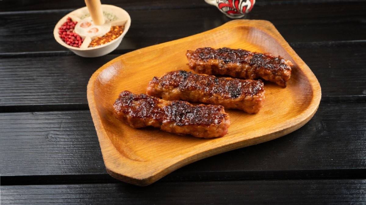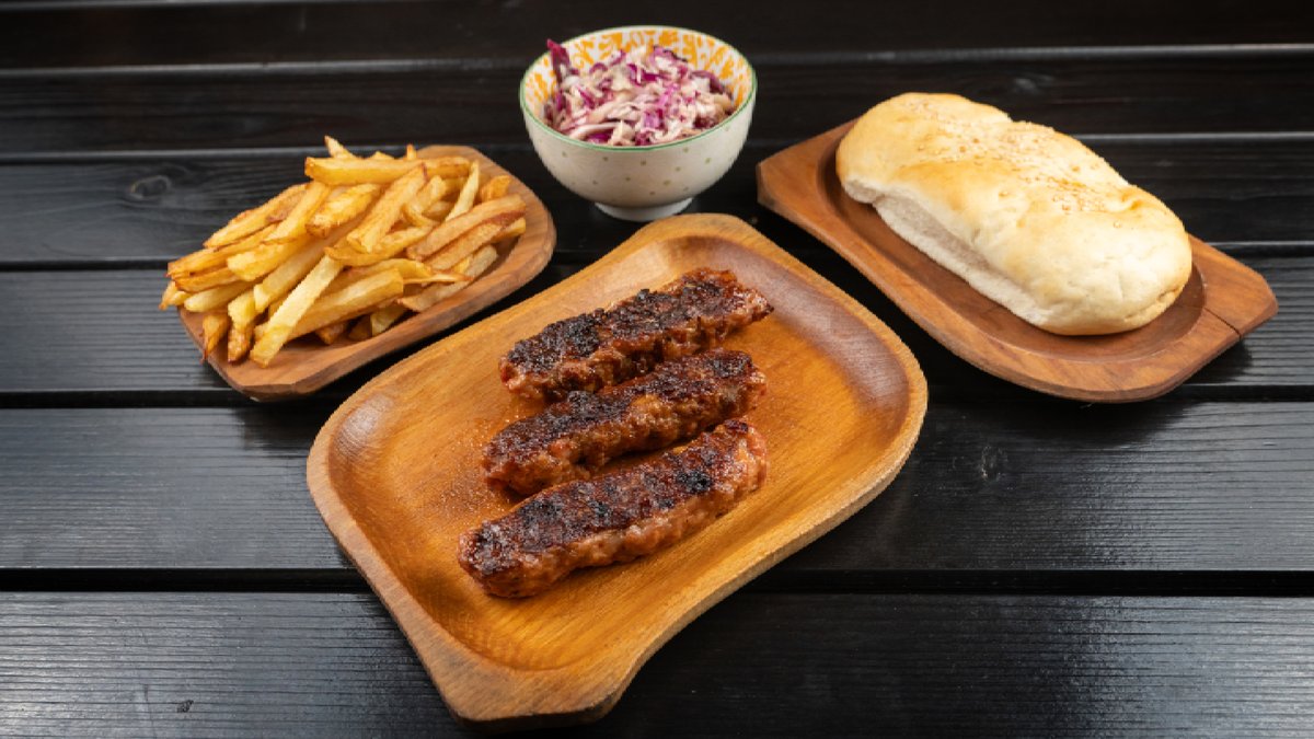 Mici (3 buc), cartofi pai naturali (150 g), chiflă (80 g), muștar (50 g).