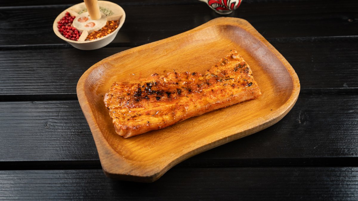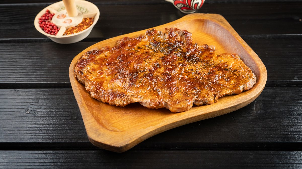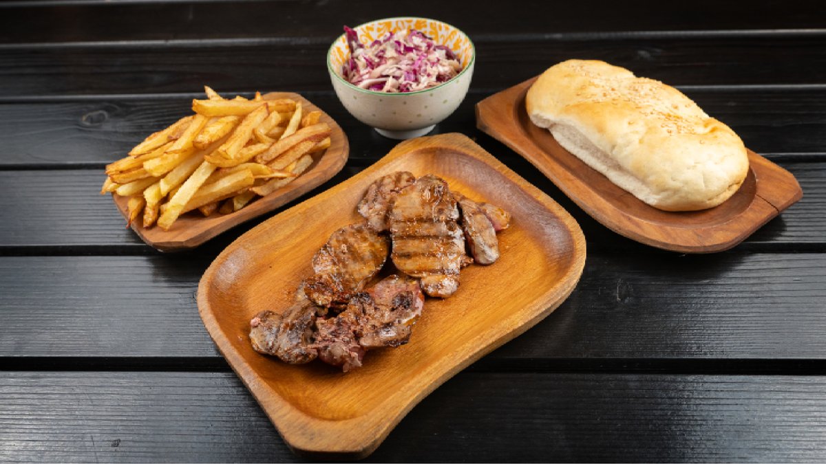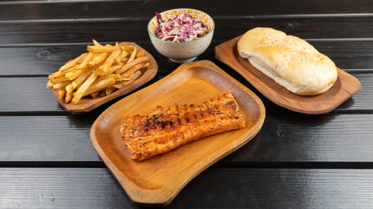 Fleică de porc (150 g), cartofi pai naturali (150 g), chiflă (80 g), salată (130 g) sau sos la alegere (50 g).