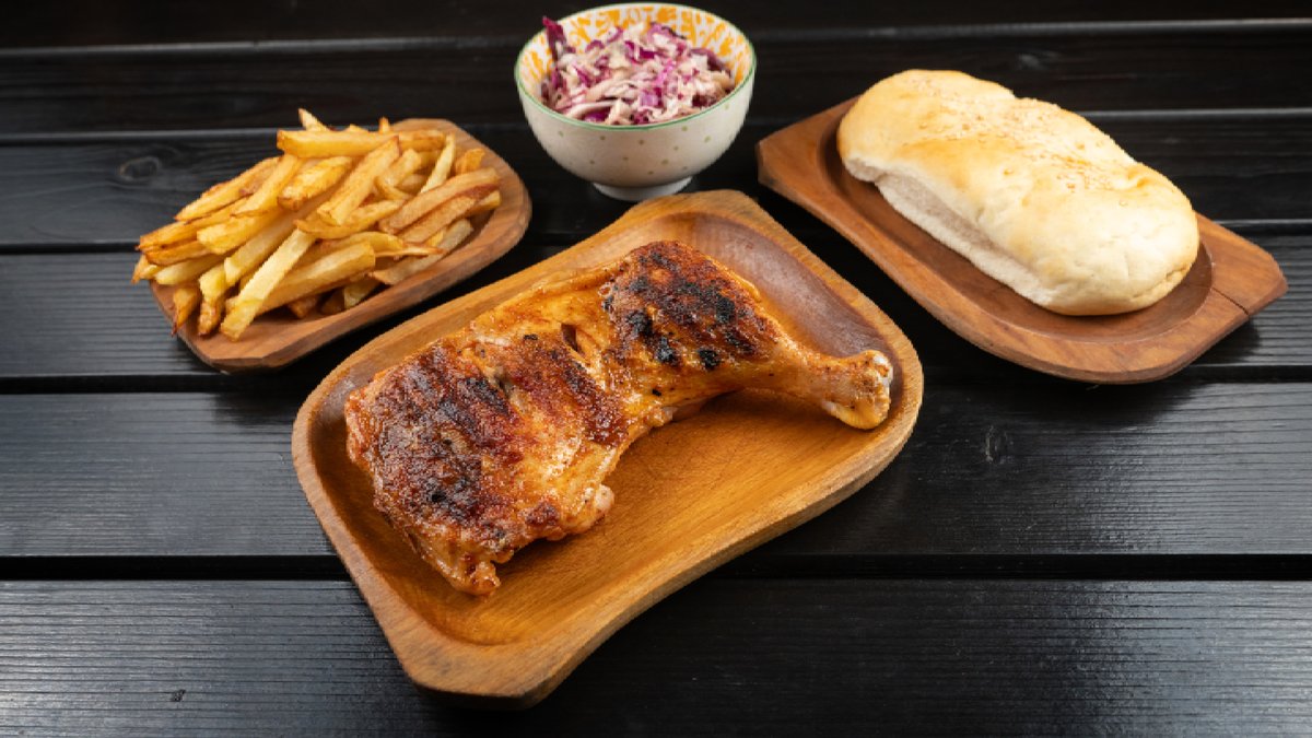 Jumătate de pui (600 g), cartofi pai naturali (150 g), chiflă (80 g), salată (130 g) sau sos la alegere (50 g).