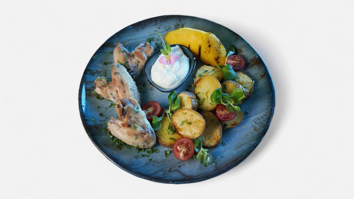 Aripioare la ceaun cu cartofi rondele lipiciosi, mujdei si mamaliguta 200/100/50/100 g