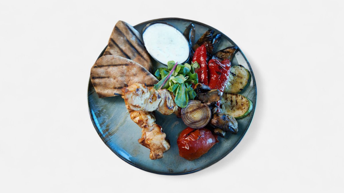 Frigarui de pui cu legume la gratar, pita si sos de usturoi 200/200/80/70 g
