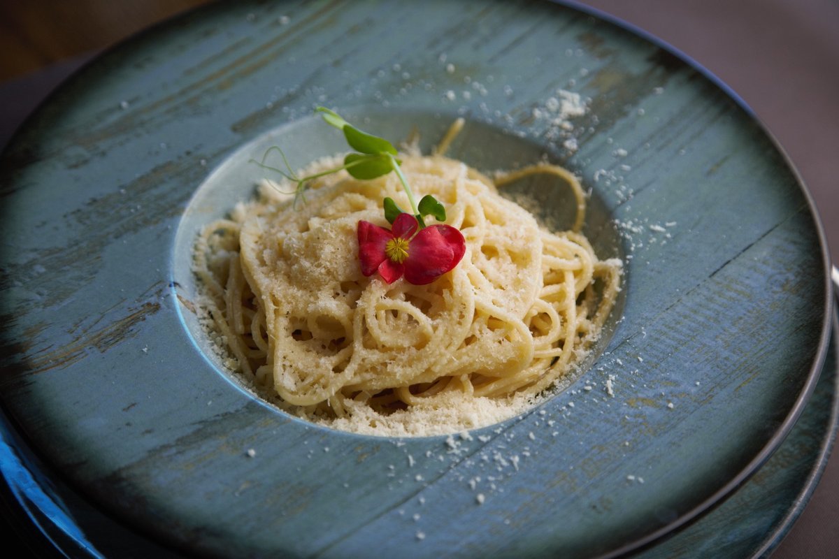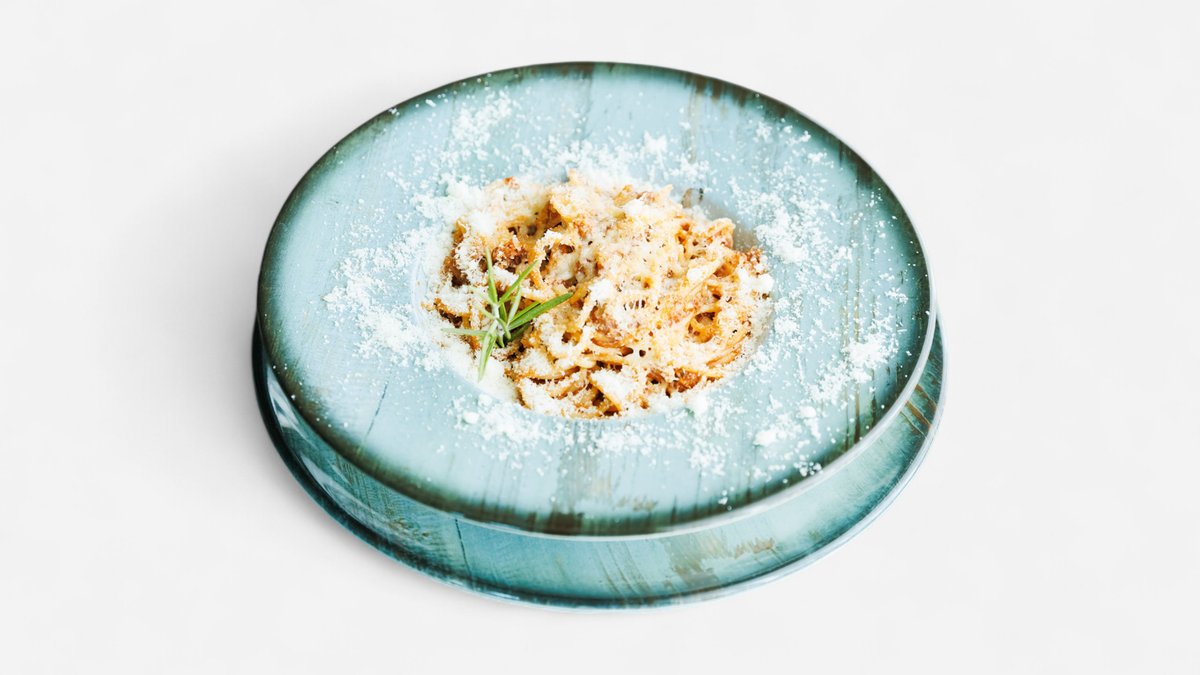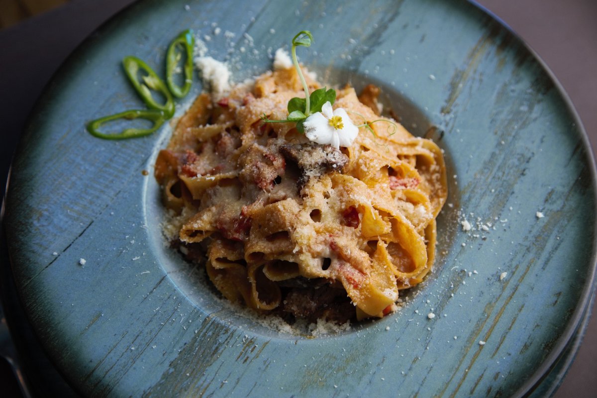 Mușchi de vită Black Angus, paste tagliatelle,parmezan, ceapă, ardei gras, suc de roșii,usturoi, busuioc, smântână lichidă