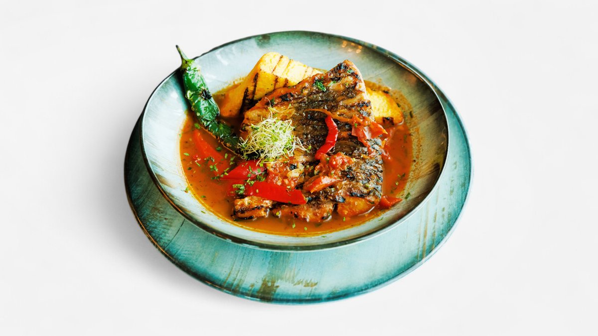 Pastrav in crusta de malai, cu mujdei de ardei copti si cartofi 180/70/200 g