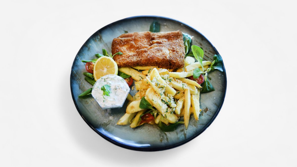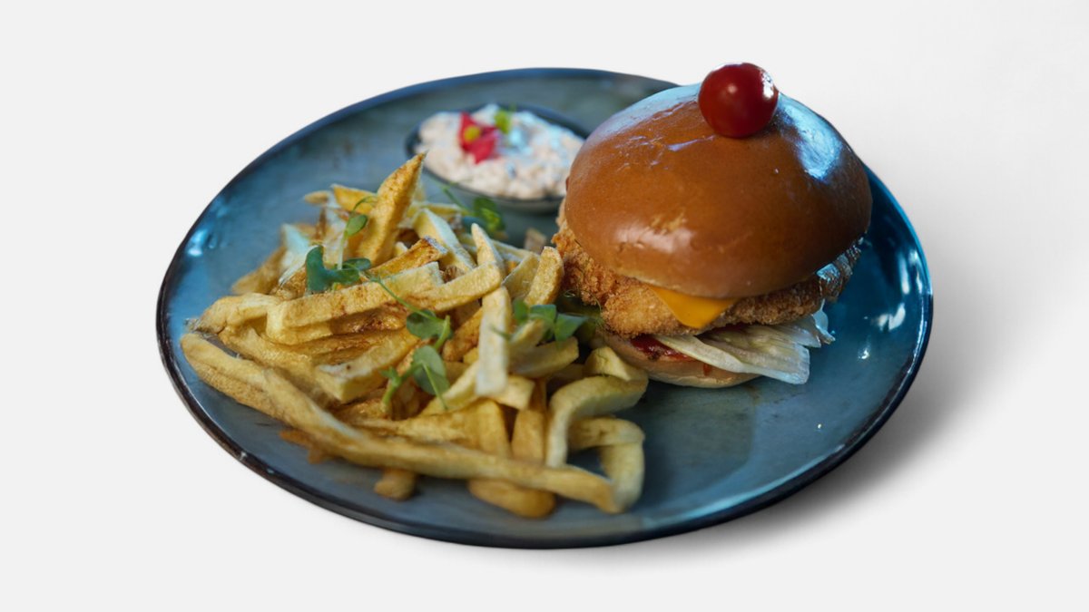 Burger pescaresc cu cartofi prajiti si sos tartar 350/150/70 g