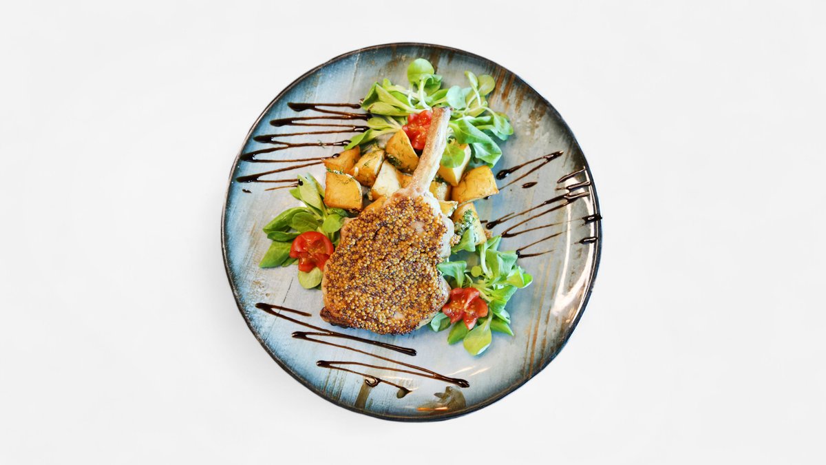 Ingrediente : Cotlet de porc cu os, cartofi, roșii cherry, frunze de valeriană, mustar Dijon