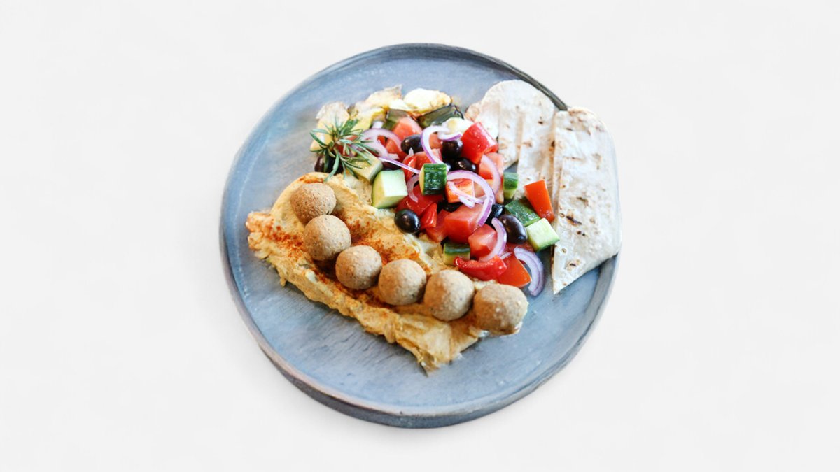 Humus, falafel, roșii, castraveți, măsline kalamata, ceapă, ulei de măsline, lipie