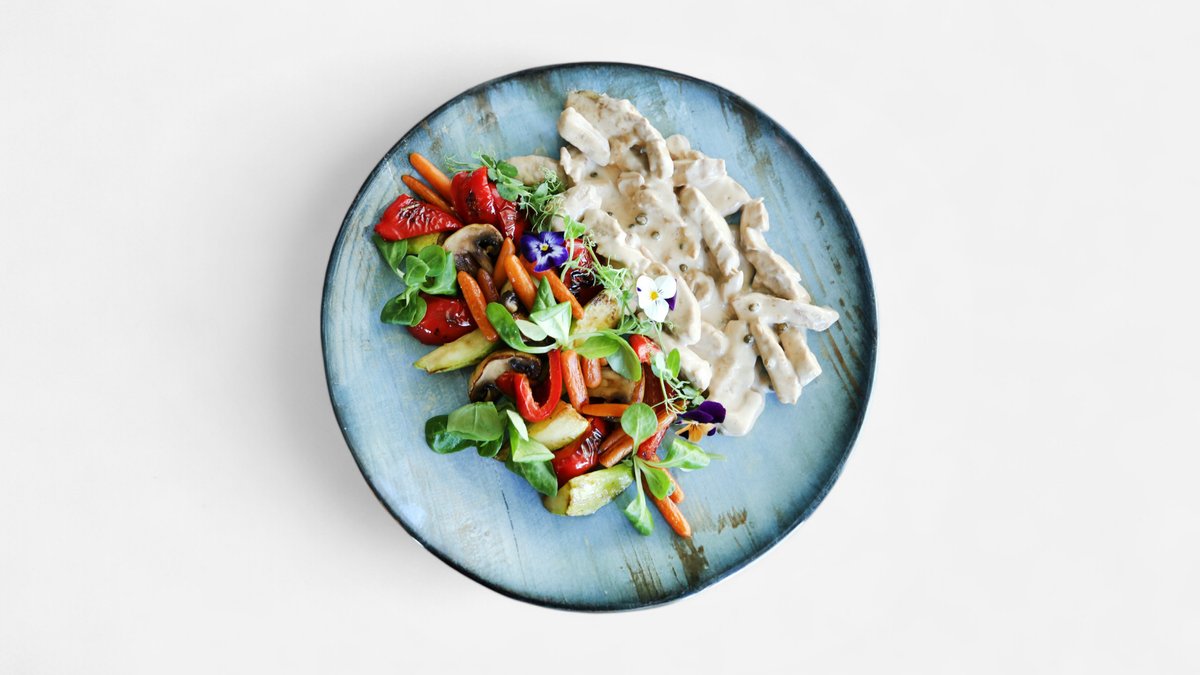 Muschiulet de porc ,Smantana lichida ,Ardei gras ,Dovlecei ,Ciuperci champignon ,morcov baby ,Piper verde in saramura;