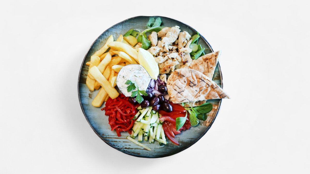 Ingrediente :piept de pui, cartofi, pita, ardei gras,castravete, roșii,ceapa, sos tzatziki, masline Kalamata