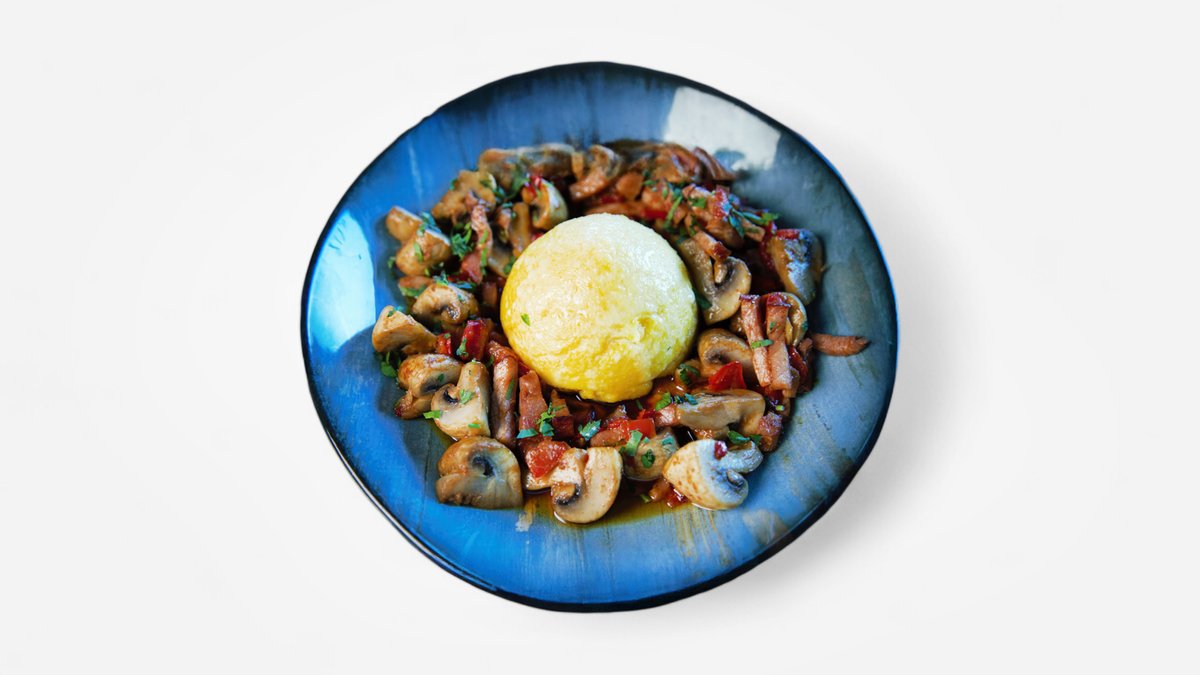 Ciuperci champignon ,Ardei gras ,Muschi file ,Bacon,Usturoi ,mamaliguta
