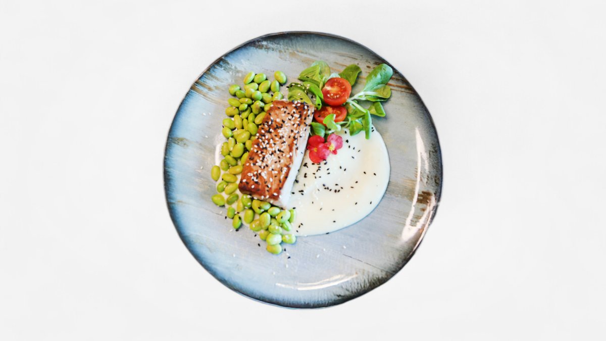 Ingrediente : file de ton, edamame, roșii cherry, piure de cartofi