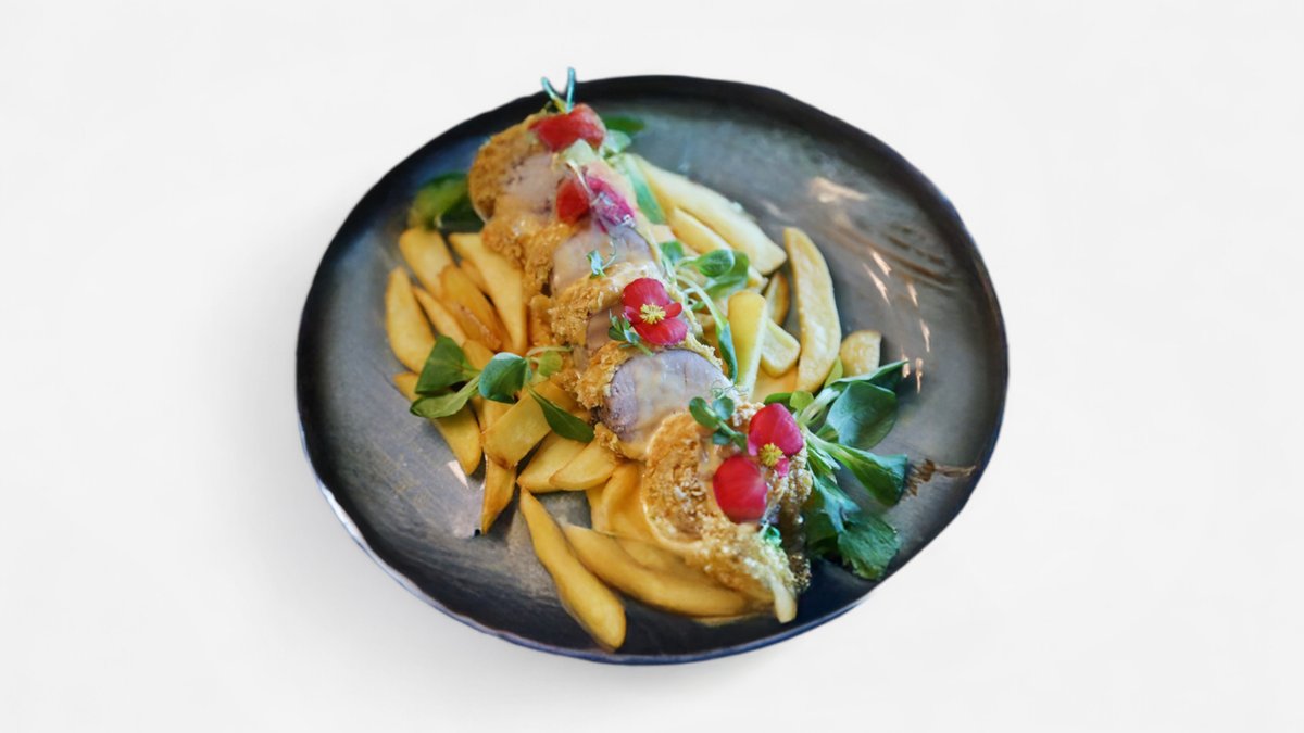 Muschiulet de porc crispy cu sos cheddar si cartofi prajiti 250/200/90 g