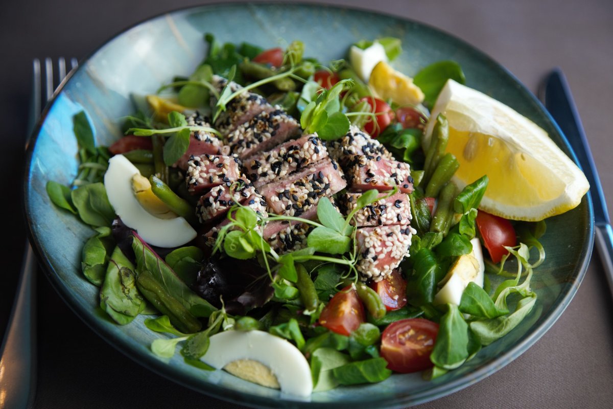 File de ton* ,Salata mix,oua ,Pastai verzi,Lamaie ,Rosii cherry ,Ulei de masline ,Semințe susan