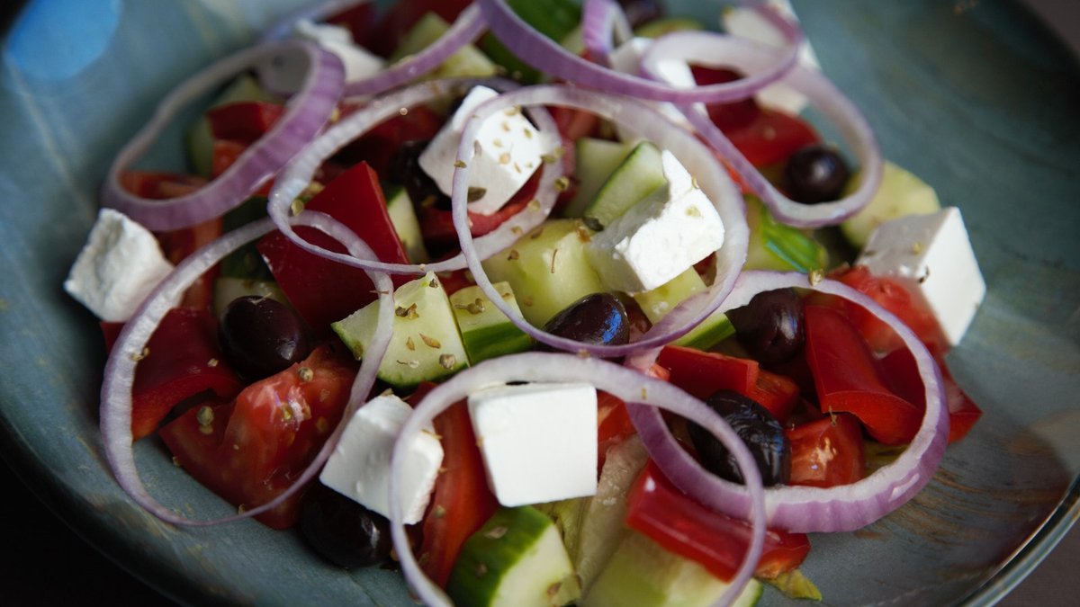 Roșii, castraveți, ardei gras, măsline Kalamata, ceapa rosie, brânză feta, ulei de masline