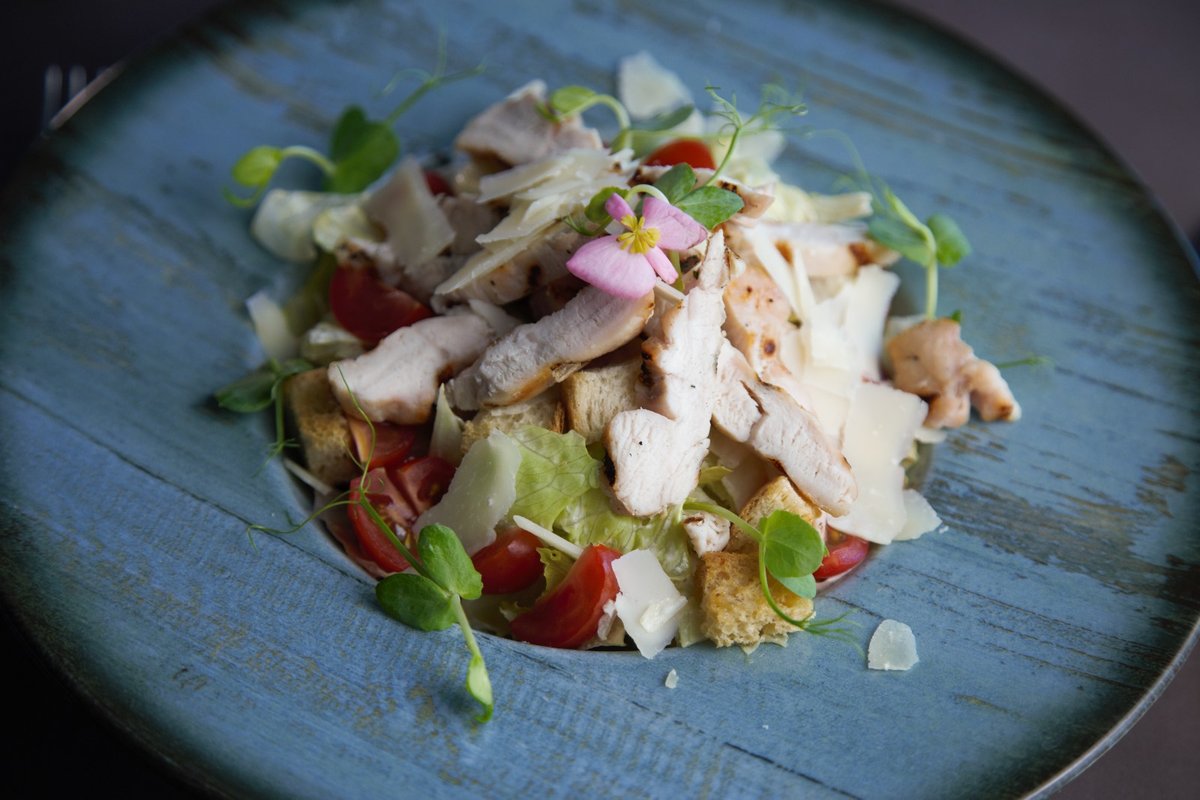 Salata iceberg ,piept pui ,Sos Caesar, crutoane, Rosii cherry, Parmezan