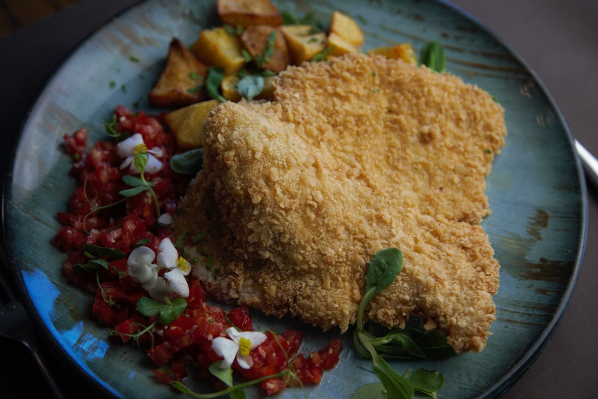 Snitel din piept de curcan cu cartofi crocanti si salsa aromata 200/150/80 g