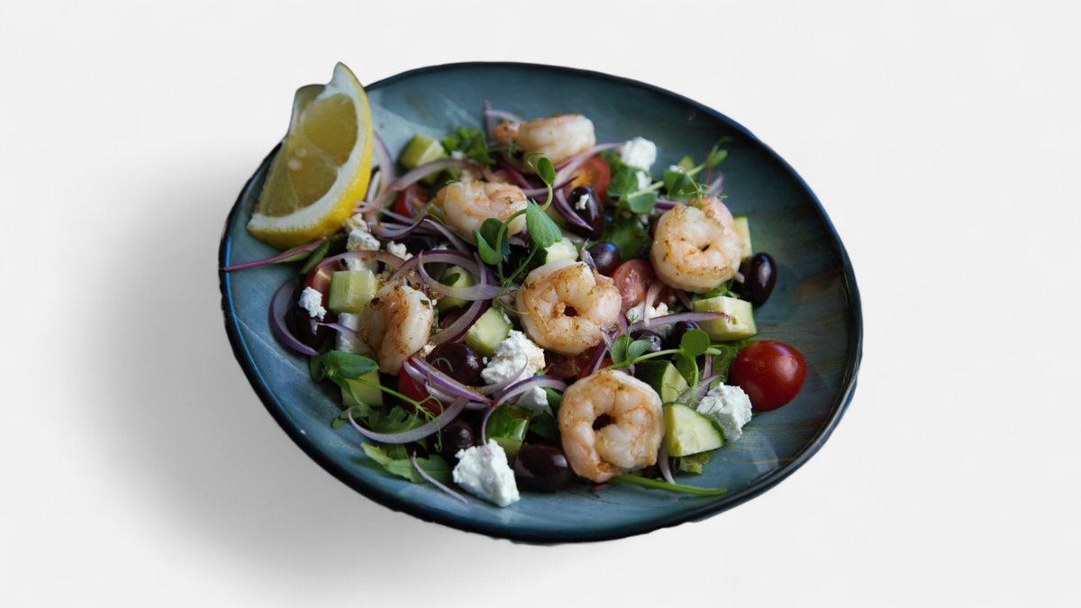 Creveti ,Rosii cherry, Salata mix,Castravete, Masline Kalamata , Branza feta Akadia, Ceapa rosie,Ulei de masline,Otet balsamic