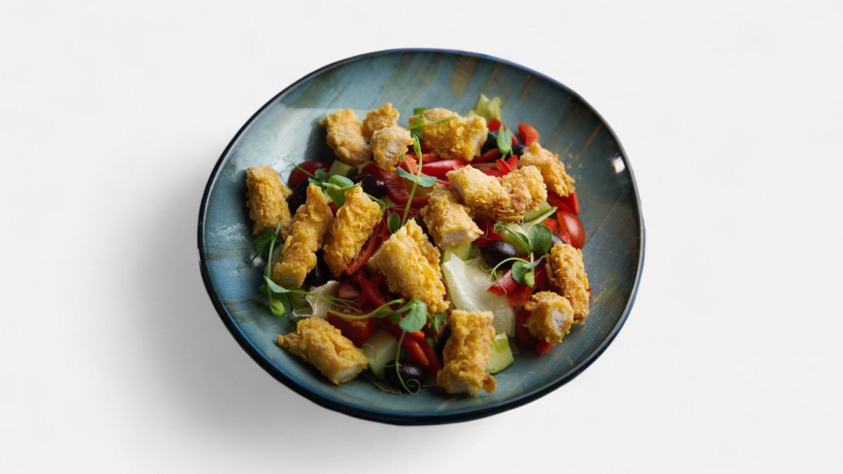Piept pui ,Salata iceberg ,Ardei gras ,Castraveti, Rosii cherry ,Masline Kalamata,Oua , Pesmet ,Fulgi porumb