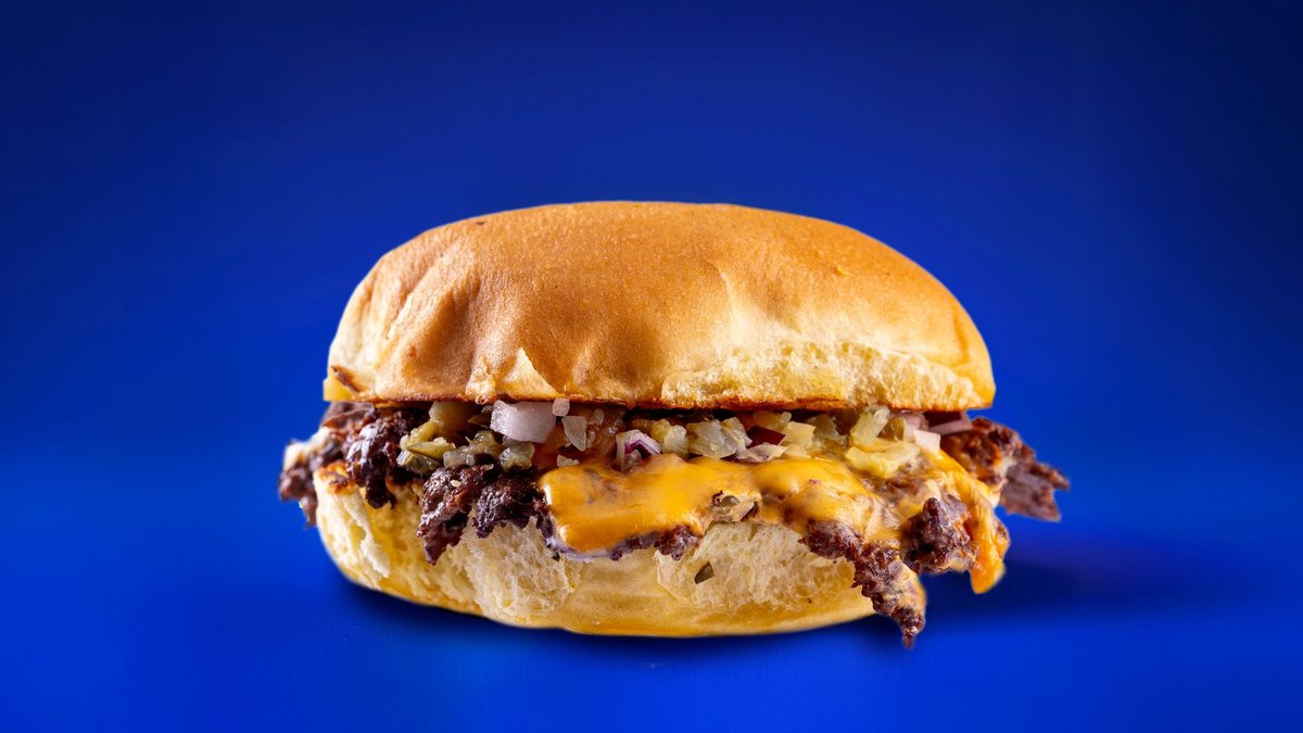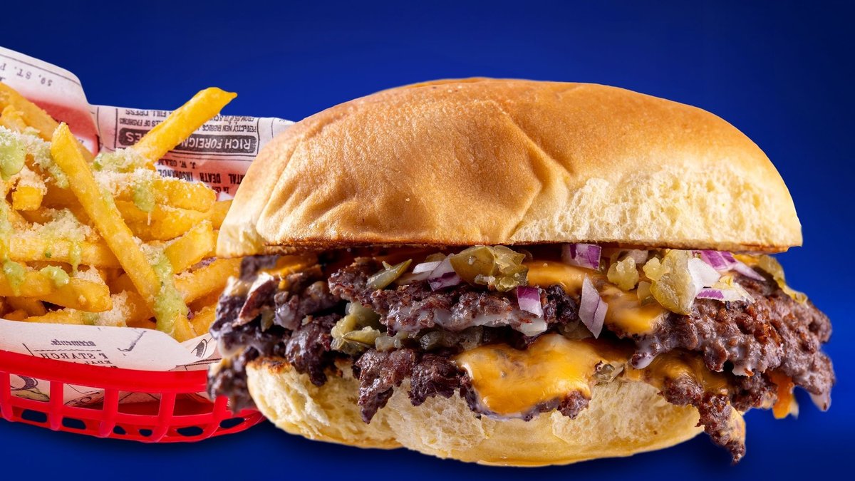 chiflă, 2 x carne vită, 2 x cheddar, castraveți murați, ceapă, ketchup, muștar. 300g