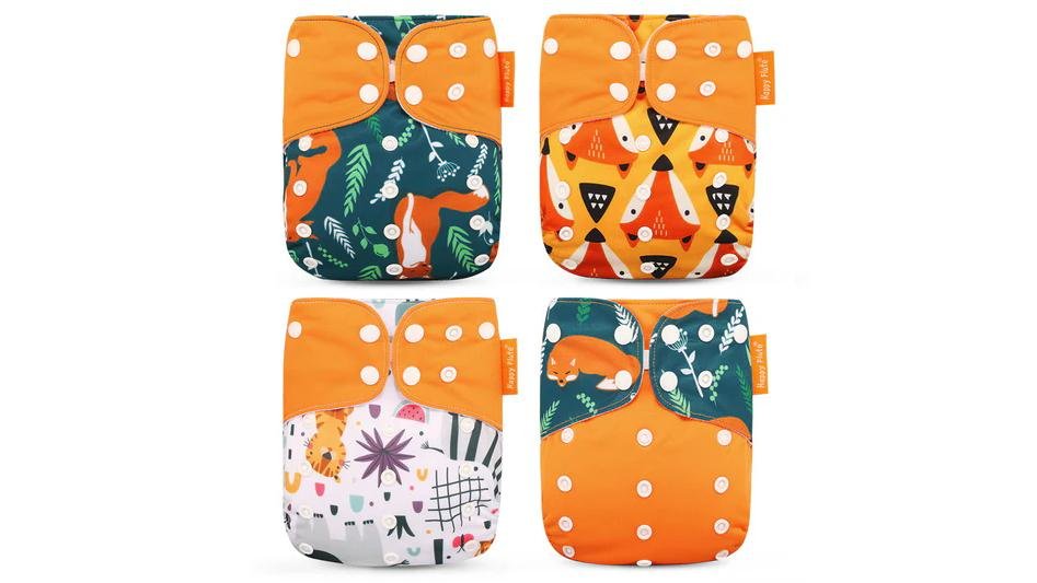Set 4 scutece bebe, 1 săculeț pentru transport si 8 inserții absorbante, Reutilizabile, Lavabile, Impermeabile, Marime Reglabilă 3kg-15kg, Portocaliu/Verde