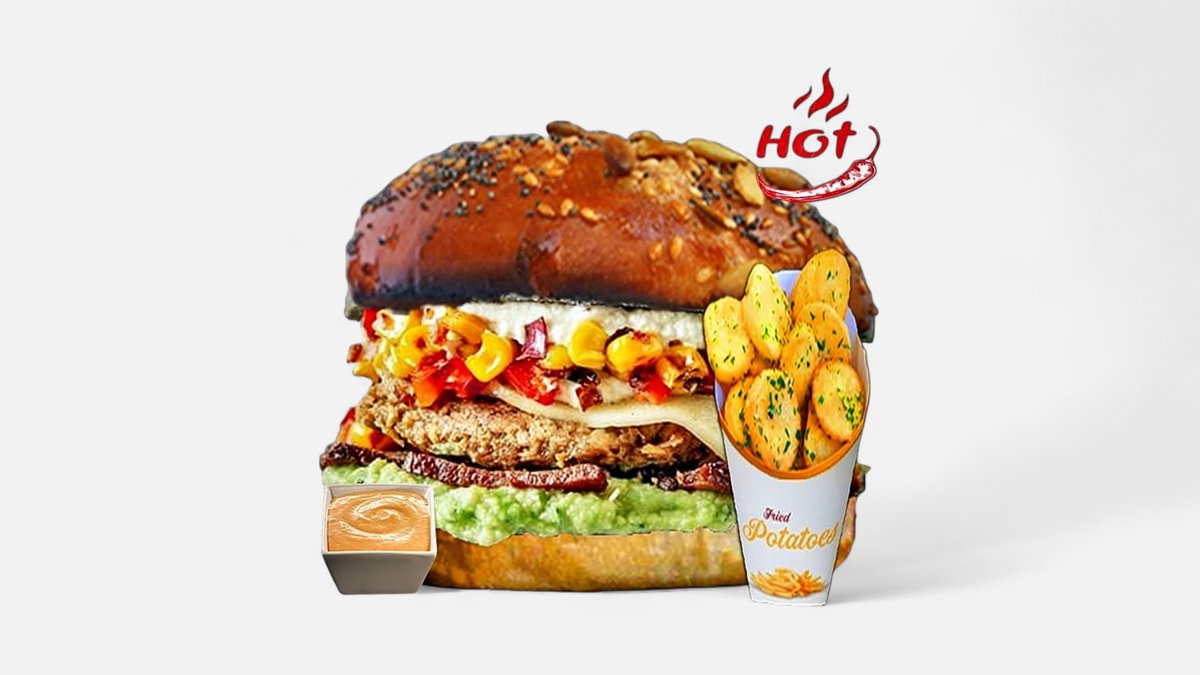 Pâine brioche cu semințe de susan și dovleac, beyoneat (proteină vegetală), iceberg, brânză vegan Violife, ceapă caramelizată, ceapă, maioneză de post, cartofi prăjiți rondele (500g)