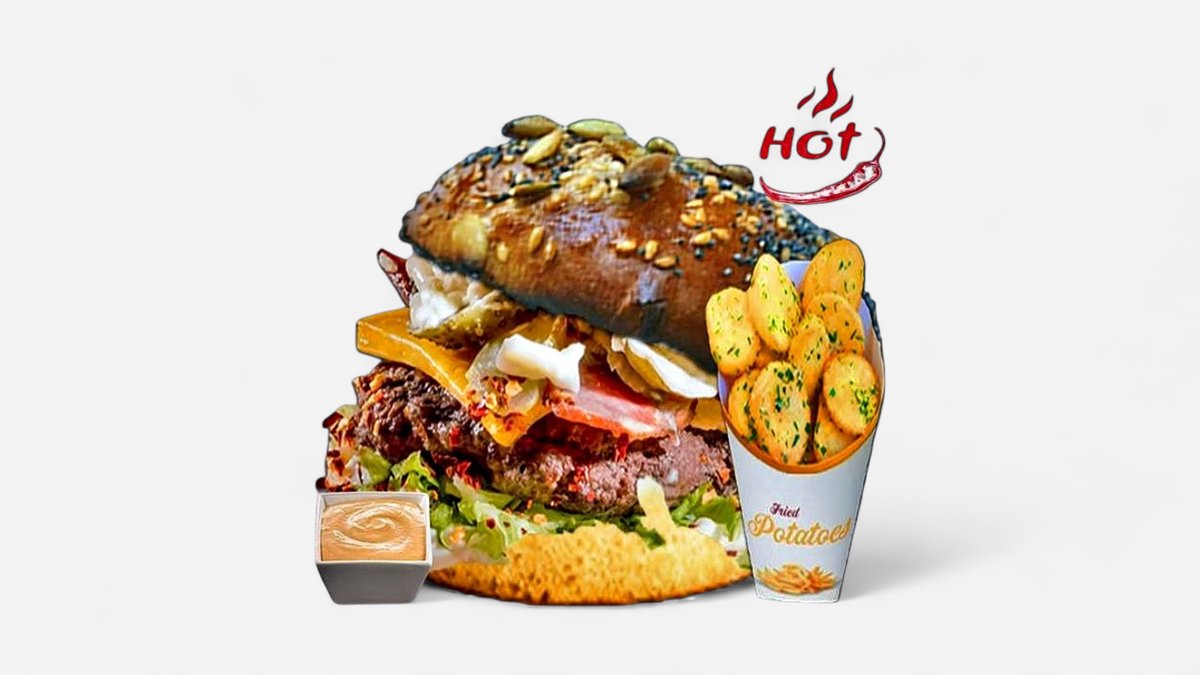 Pâine brioche cu semințe de susan și dovleac, carne de vită, jambon, ciuperci, cedar, roșii, iceberg, maioneză de casă, ceapă și caramelizată, castraveți murați, sos Bigbur, cartofi prăjiți rondele. 500g