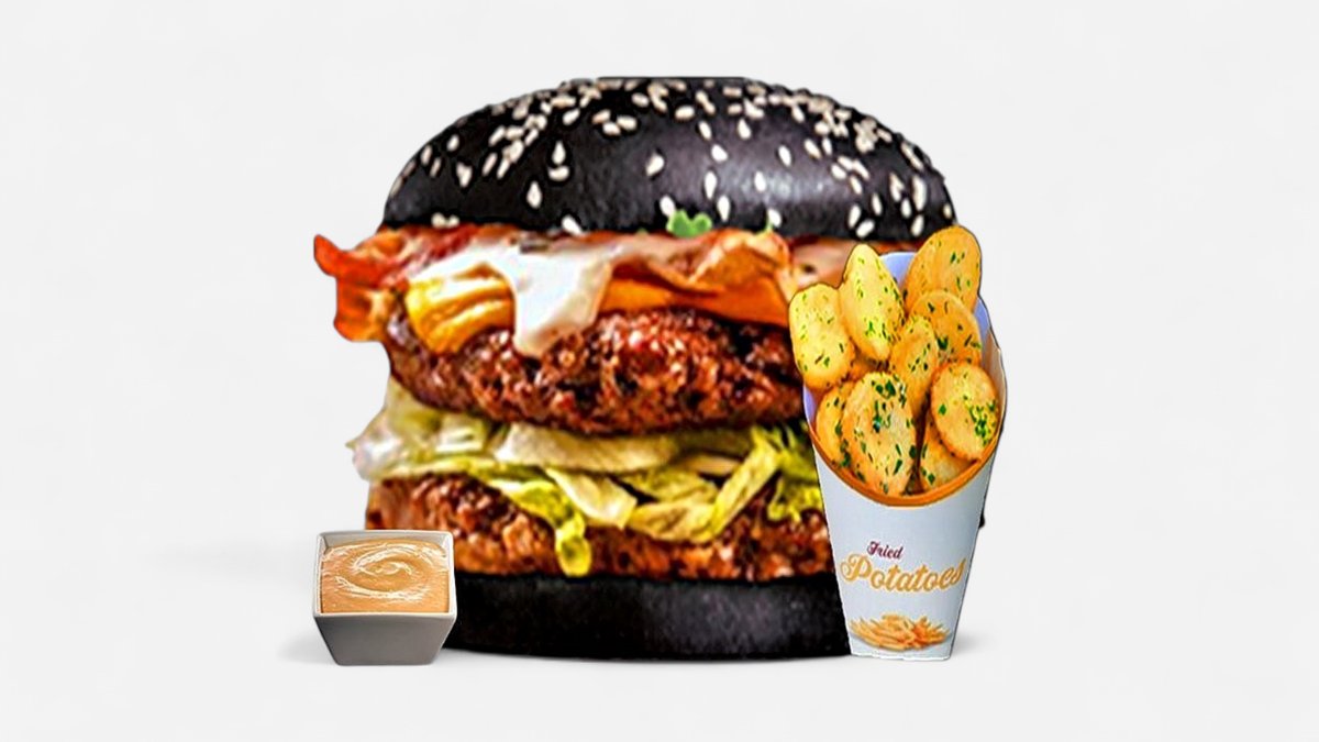 Pâine brioche cu semințe de susan și dovleac, carne de Vită doublă, maioneză de casă, rucola, salată Iceberg, Busuioc, Cedar, Parmigiano, Gorgonzola, porcini, anghinare, sos Bigbur, cartofi prăjiți rondele. 650g