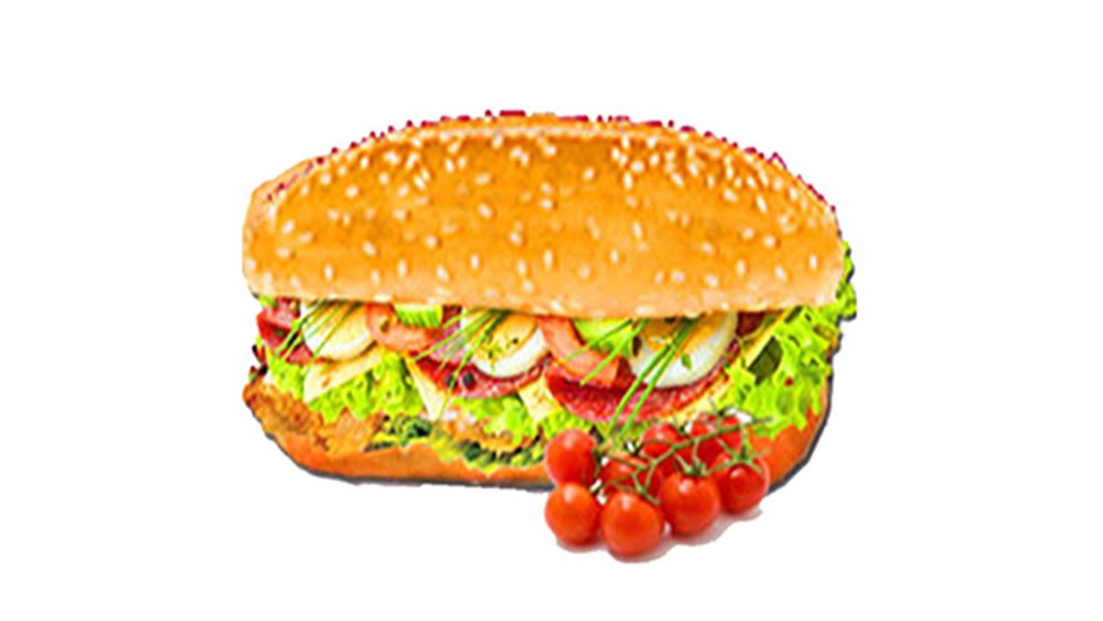 Pâine brioche cu semințe de susan sau la Gigantic Maxi Ceabata, Ton, Cedar, măsline verzi, ceapă, ou, roșie, avocado, pesto, sos maioneză de usturoi (normal 280g sau Gigantic 700g)