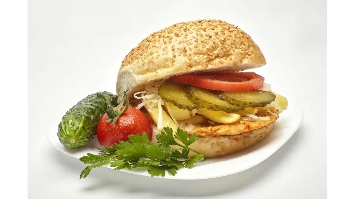 1 lipie 150 g carne 50 g salată verde 30 g roșii 30 g castraveți murați 20 g ceapă 60 g sos alb