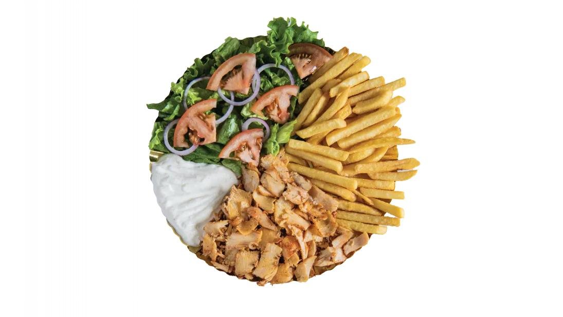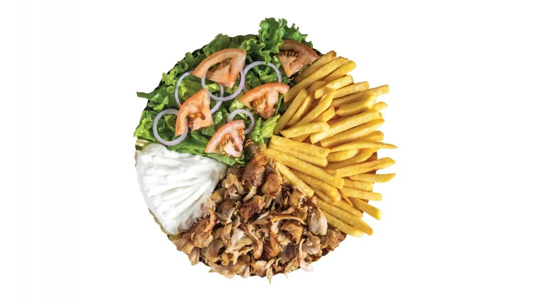 Carne de pui + carne curcan 120g, cartofi prăjiți 150g, salată 40g, sos de maioneză cu usturoi (de casă) 50g, roșii, 20g Total: 380g + pita pe vatră 100g