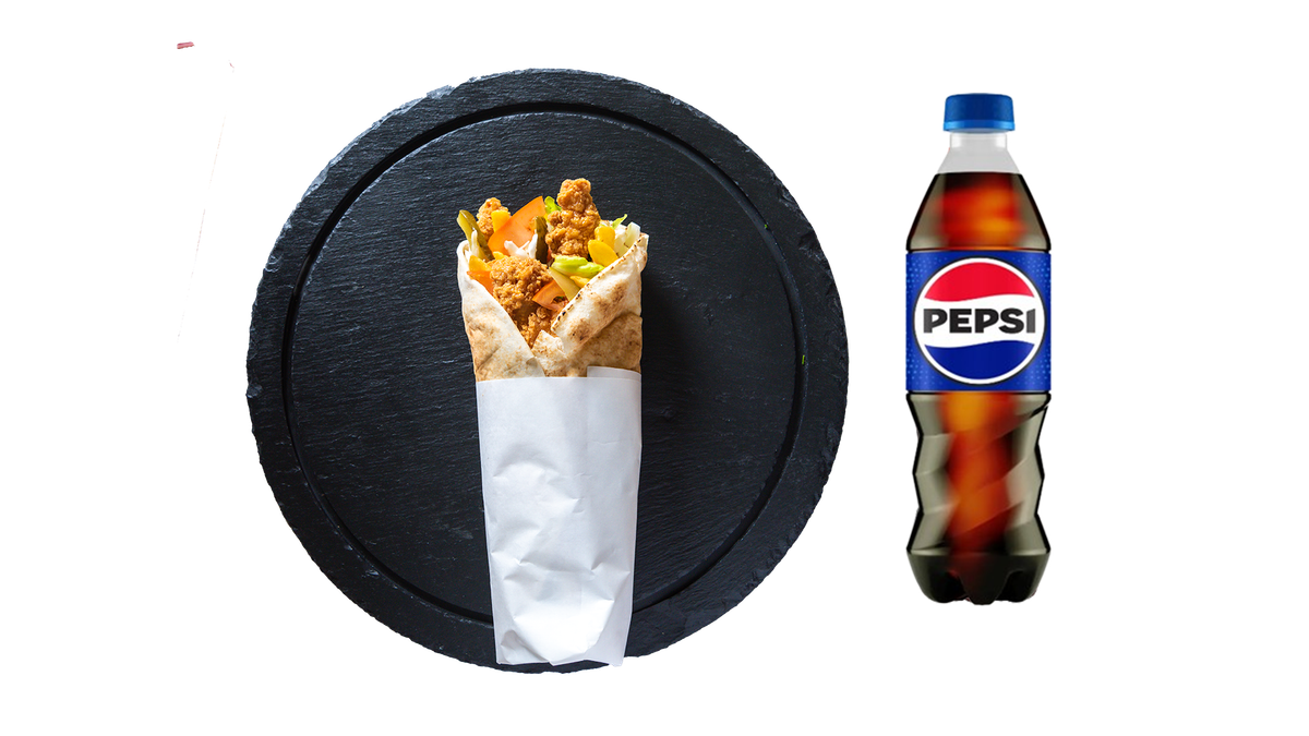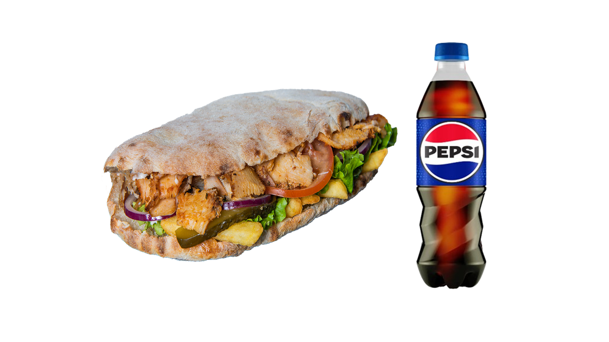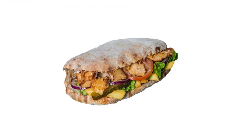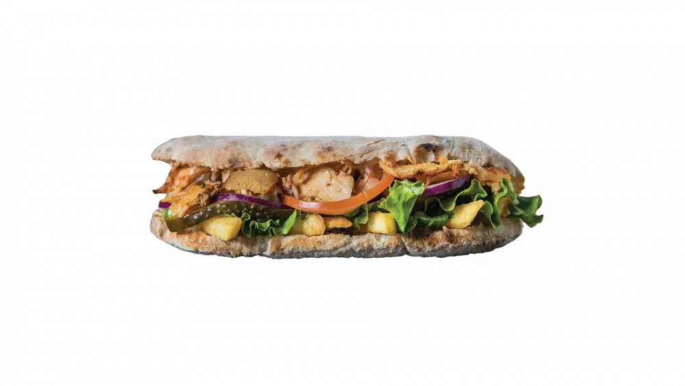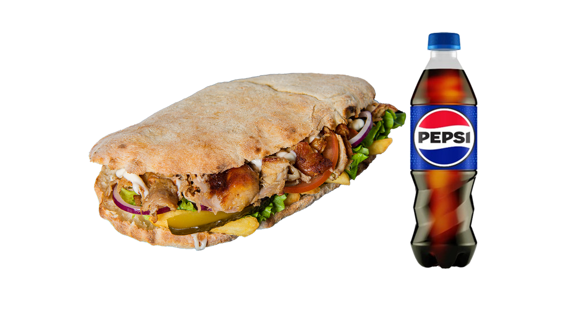 pita pe vatră pe vatră 140g, carne de pui rotisată 100g, salată 50g, sos de maioneză cu usturoi (de casă) 40g, roșii 40g, castraveți murați 20g, rondele de ceapă roșie 10g, cartofi prăjiți 100g Total: 500g