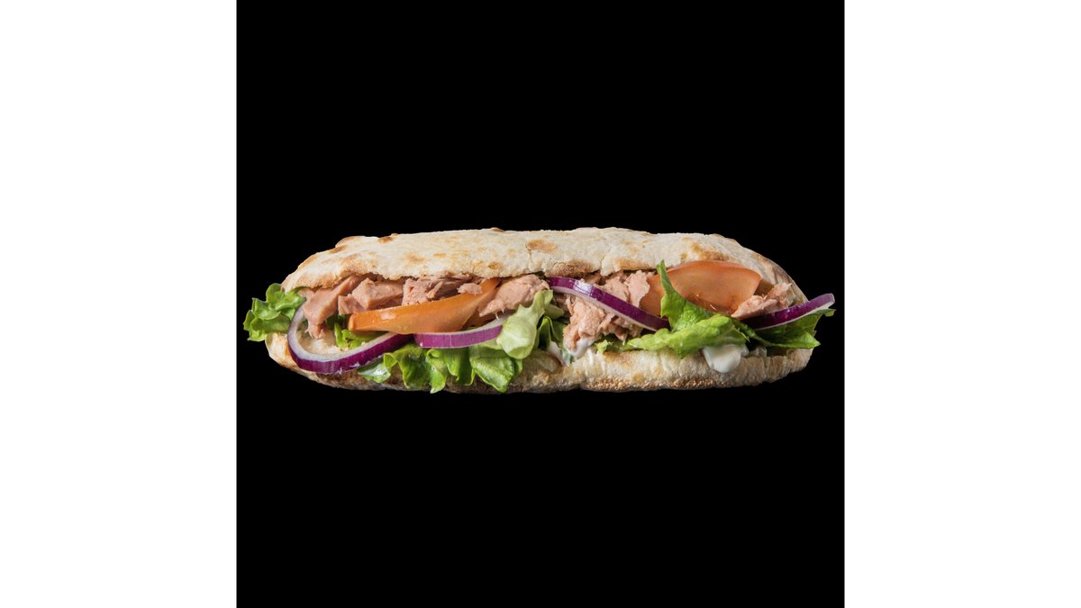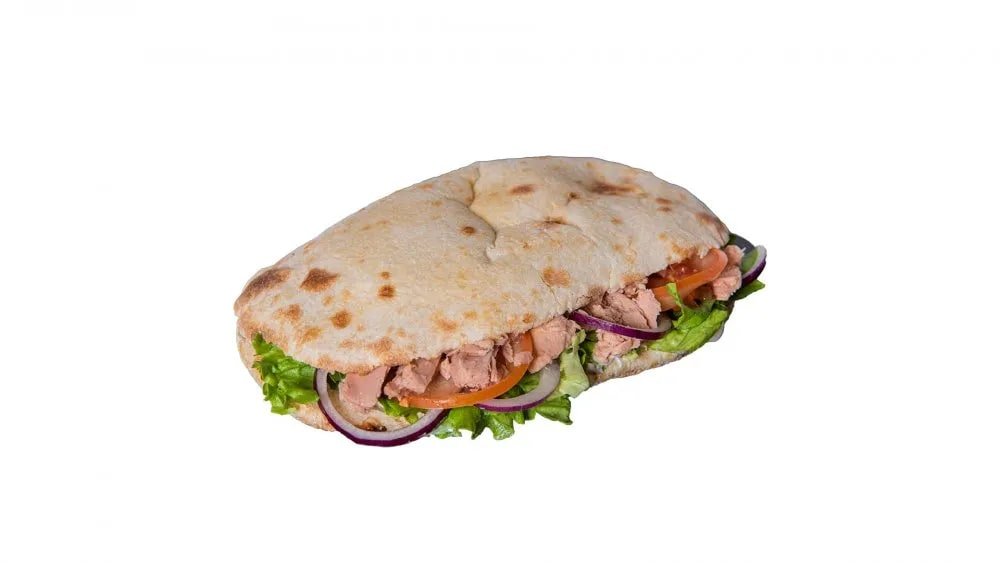 pita pe vatră pe vatră120g, ton 80g, salată 40g, sos de maioneză cu usturoi (de casă) 30g, roșii 30g, rondele de ceapă 20g Total: 320g