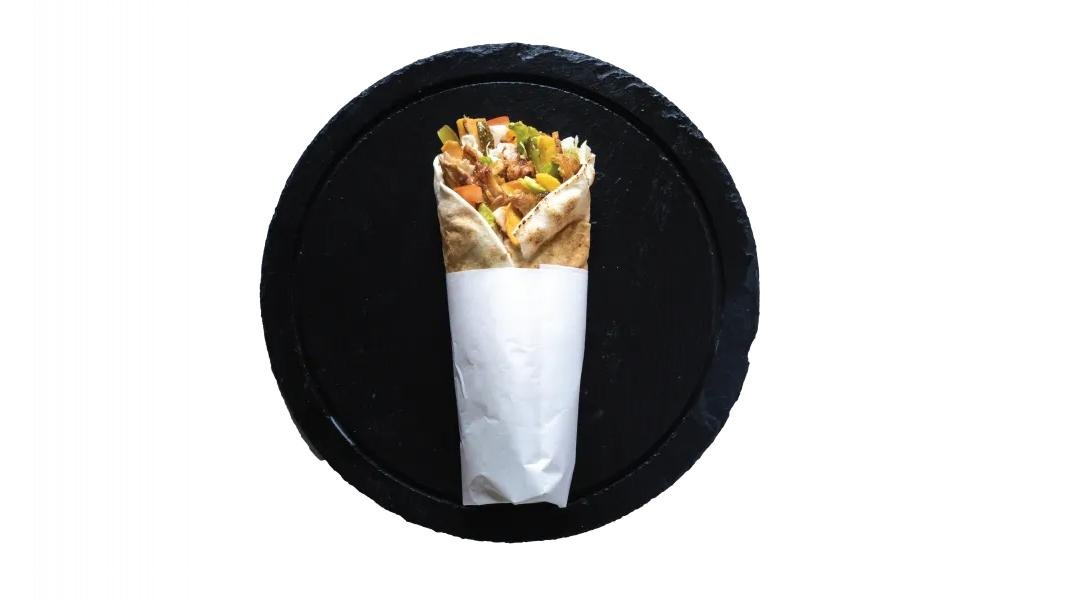 pita pe vatră pe vatră 120g, carne de pui rotisată 40g + carne de curcan rotisată 40g, salată verde 40g, sos de maioneză cu usturoi (de casă) 40g, roșii 20g, castraveți murați 20g, rondele de ceapă roșie 10g, cartofi prăjiți 40g Total: 370g