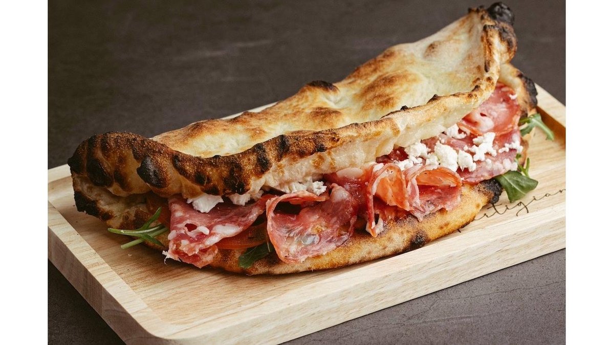 blat de pizza napoletan (făină 00 Caputo, drojdie, sare, apă), mozzarella fior di latte, salam Napoli, prosciutto cotto, sos de roșii San Marzano D.O.P., ardei Kapia, măsline negre rondele, ceapă roșie, ulei de măsline ev, busuioc proaspăt