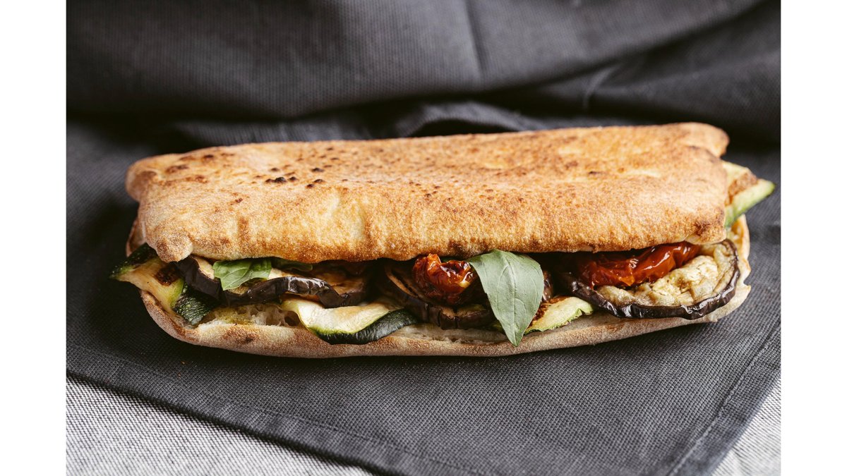 blat de pizza napoletan (făină 00 Caputo, drojdie, sare, apă), sos de roșii San Marzano D.O.P., zucchini, vânătă, ardei Kapia, măsline Kalamata, ceapă roșie, ulei de măsline ev cu trufe negre, busuioc proaspăt