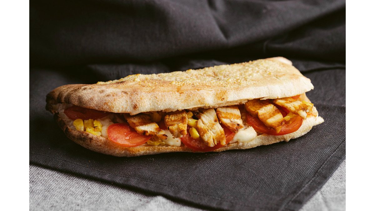 Blat de pizza napoletan , piept de pui, mozzarella fior di latte, roșii, porumb dulce, grana padano, ulei de măsline extra virgin - 270g