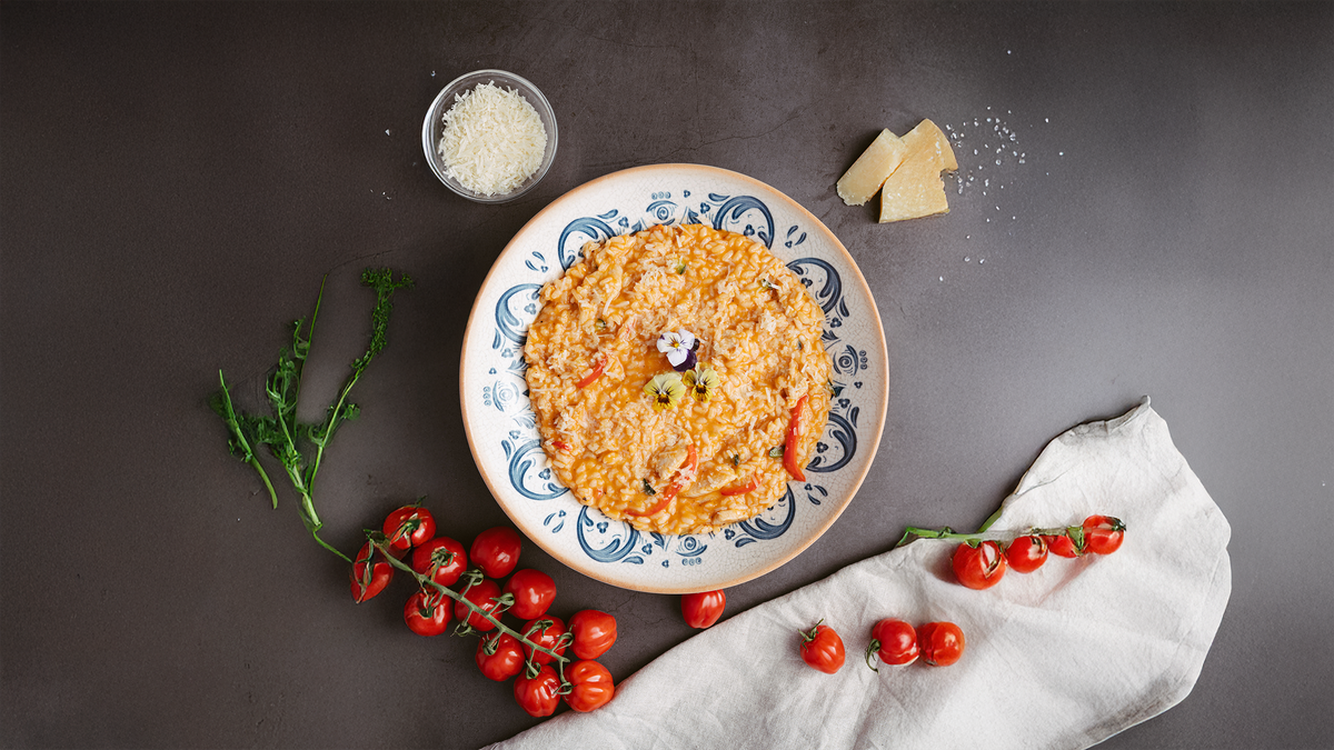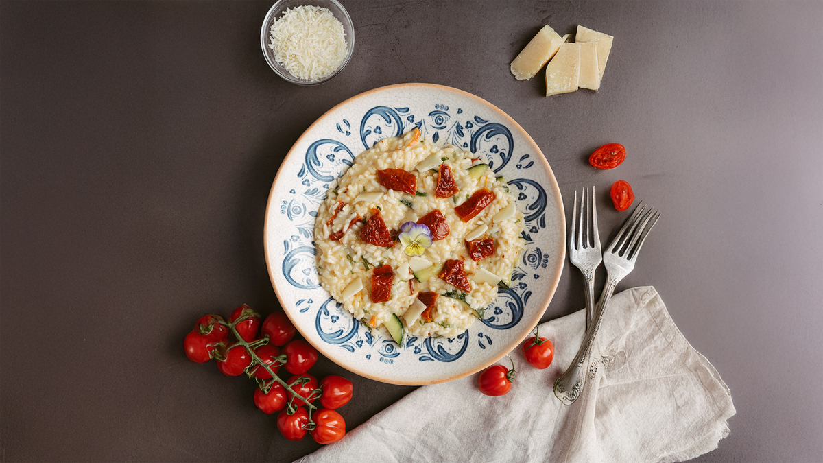 Orez Arborio, supă de legume (morcov, păstârnac, țelină, ceapă, ardei gras), zucchini, pomodorri secchi, parmigiano reggiano D.O.P., unt 82%, vin alb, mentă verde, ceapă albă, grana padano, ulei de măsline ev, piper, sare