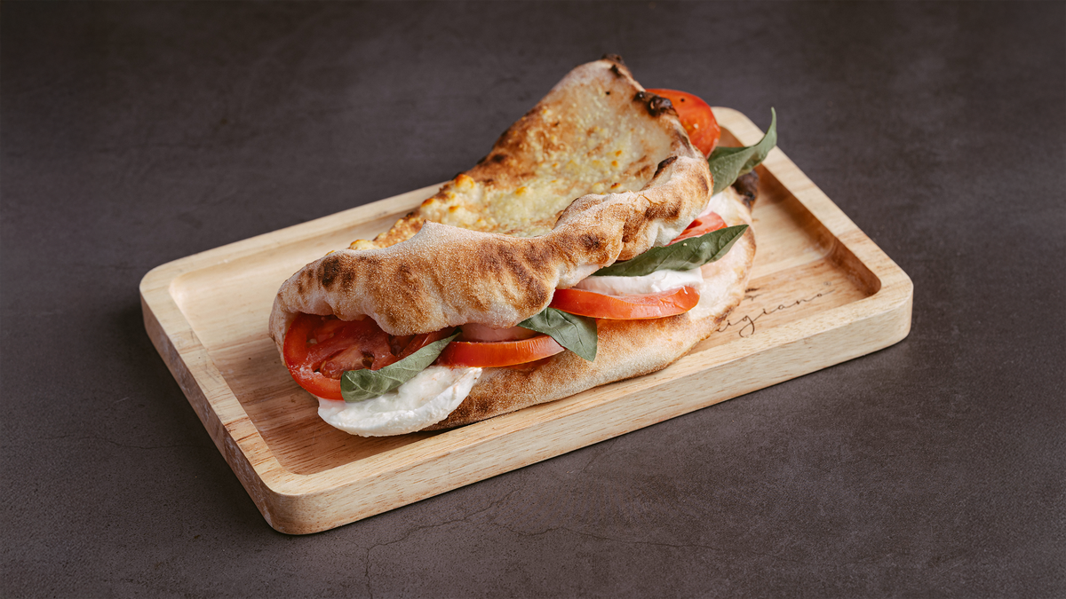 blat de pizza napoletan (făină 00 Caputo, drojdie, sare, apă), mozzarella di bufala Campana D.O.P., mozzarella fior di latte, sos de roșii San Marzano D.O.P., roșii cherry, rucola, ulei de măsline ev, busuioc proaspăt