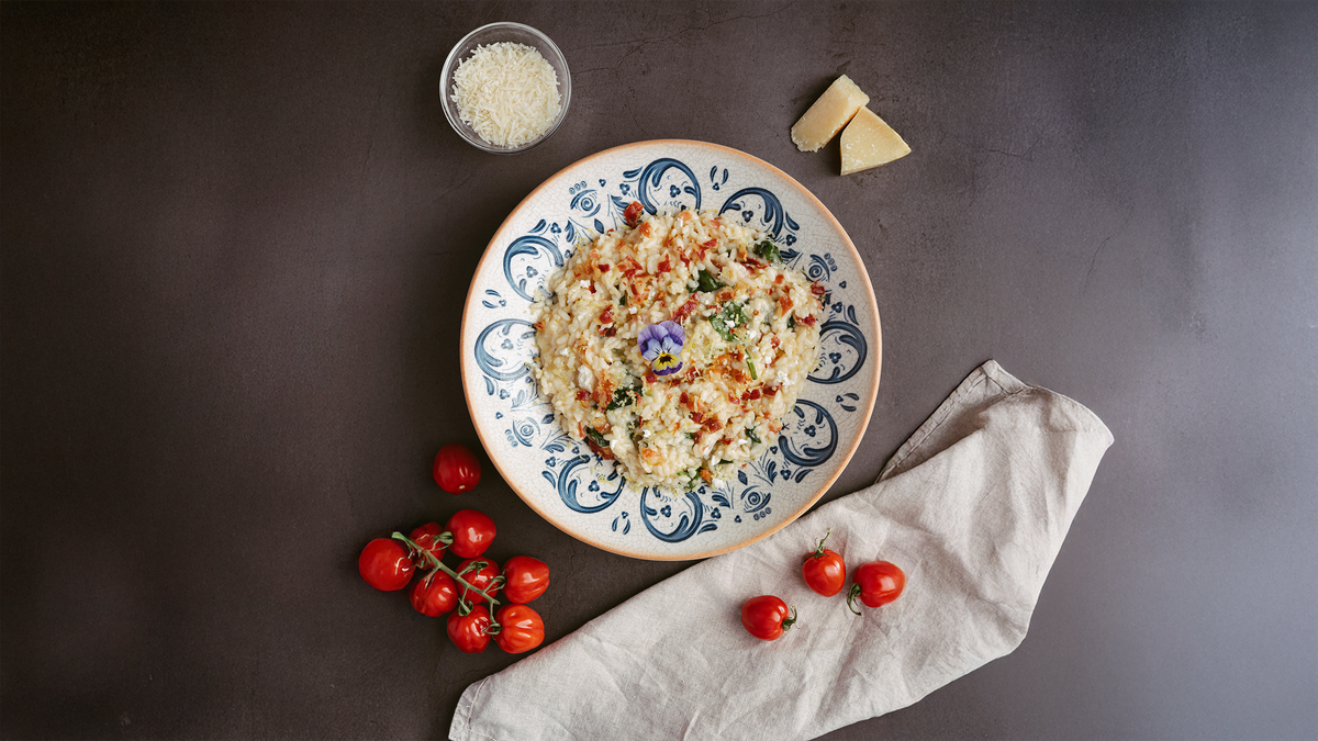 Orez Arborio, supă de legume (morcov, păstârnac, țelină, ceapă, ardei gras), pancetta arrotolata, parmigiano reggiano D.O.P., unt 82%, brânză Feta, vin alb, baby spanac, ceapă albă, lămâie rasă, ulei de măsline ev, piper, sare