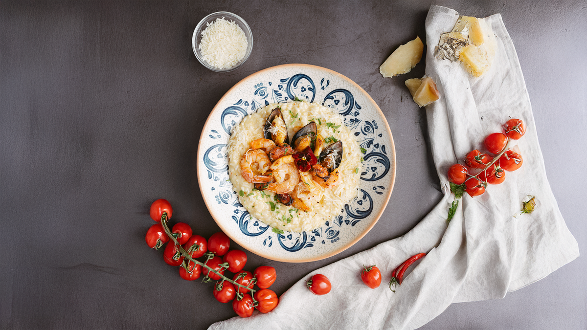 Orez Arborio, supă de legume (morcov, păstârnac, țelină, ceapă, ardei gras), creveți cu codiță**, inele de calamar**, scoici în cochilie**, parmigiano reggiano D.O.P., unt 82%, vin alb, ceapă albă, usturoi, pătrunjel, ulei de măsline ev, piper, sare