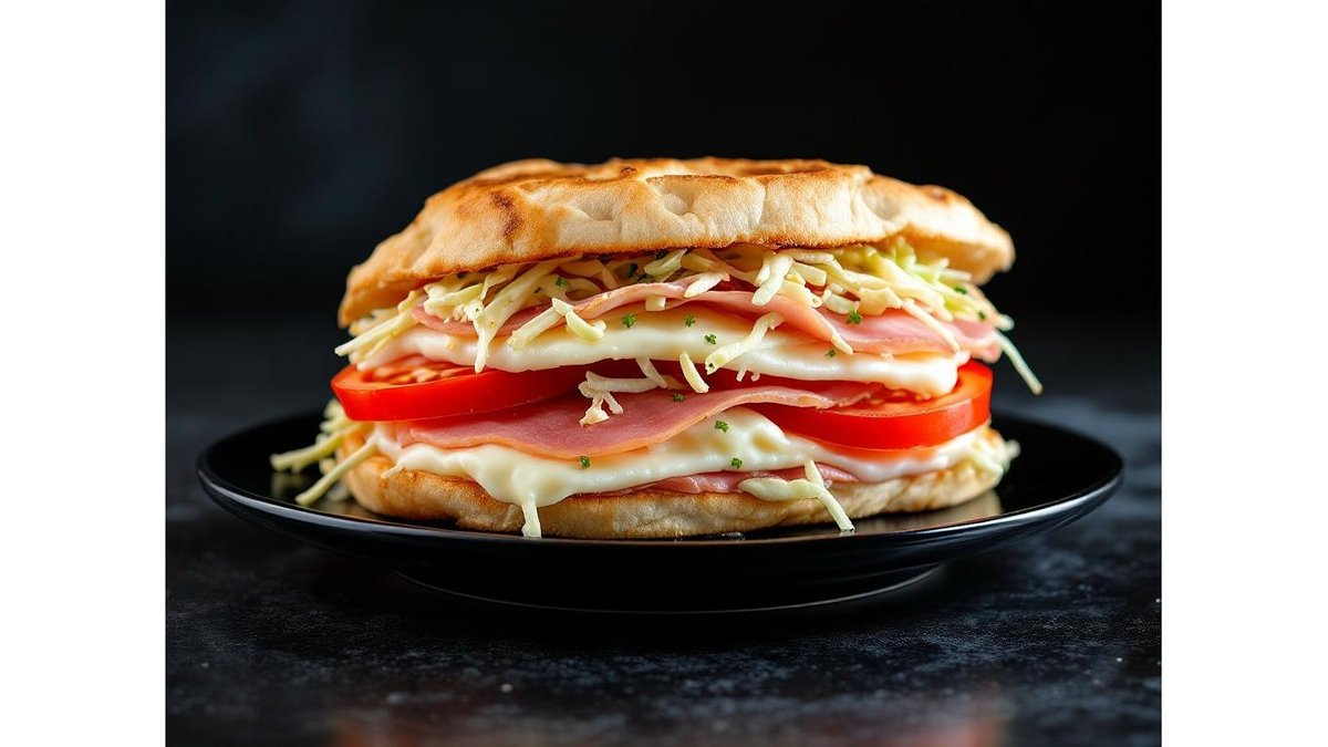 Pită, mozzarella, șuncă presată, salată coleslaw, roșii 250g