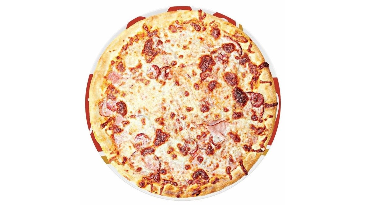 Sos roșii, bacon, șuncă presată, ardei, mozzarella, oregano, ciuperci, măsline