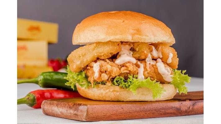 Chiflă, sos, salată, crispy de pui, cheddar, ceapă, roșie, castraveți, ketchup, cartofi pai 520g