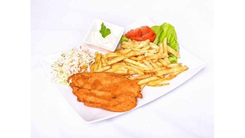 Piept de pui, cartofi prăjiți, salată de varză, maioneză cu usturoi 500g