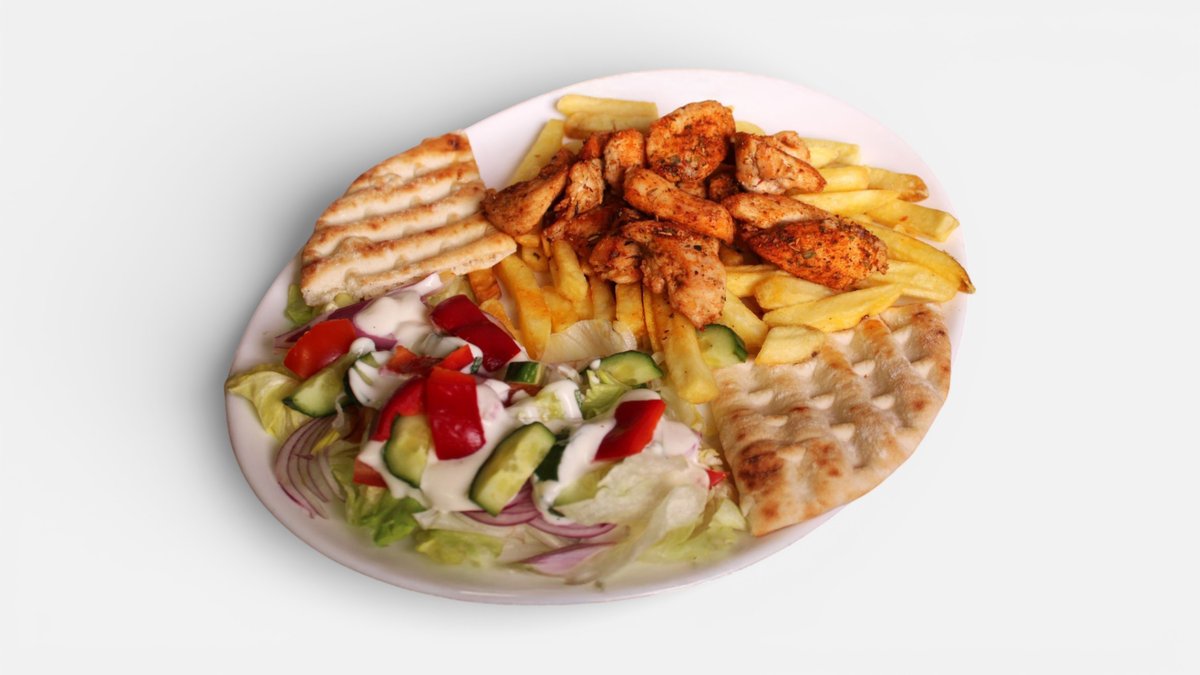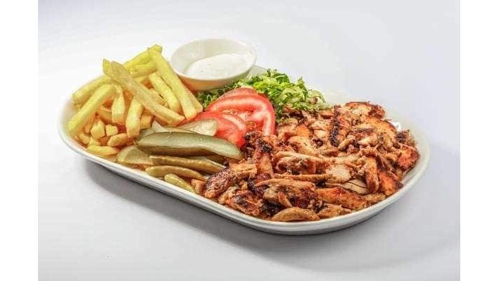 Piept de pui, cartofi prăjiți, ardei iute, salată de varză, maioneză cu usturoi 500g