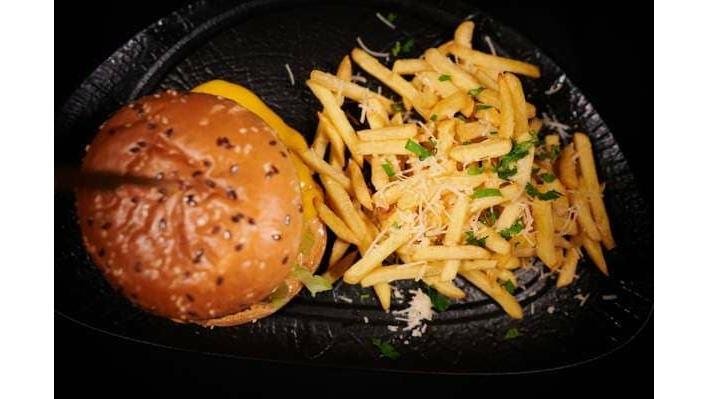 Chiflă, sos, salată, carne de vită, cheddar, ceapă, roșie, castraveți, ketchup, cartofi pai 475g